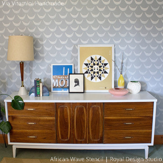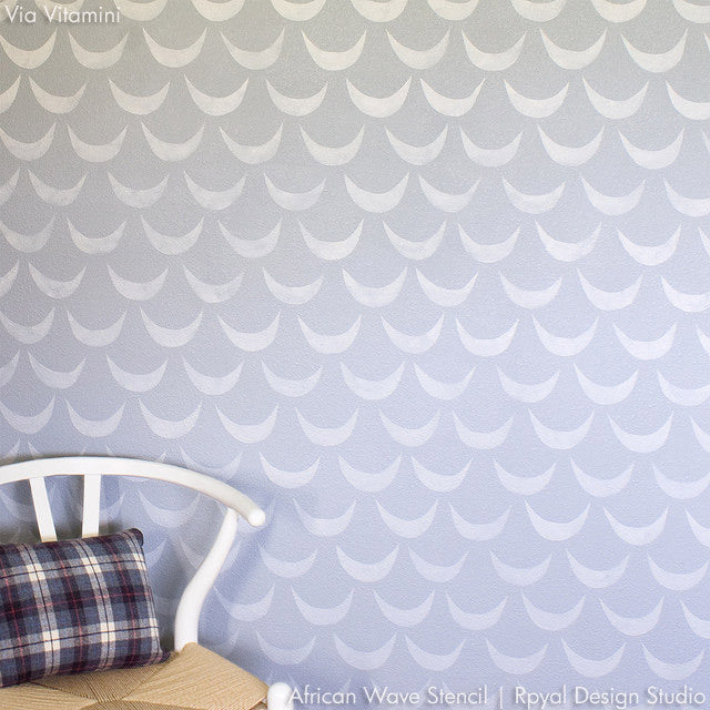 The African Wave Wall Stencil adds movement and texture to walls and furniture. This tribal and Afro-Chic design can also double as a scallop wave for beach themed home decor. To decorate scrapbooks and small DIY projects with a similar look, use our African Wave Craft Stencil.
