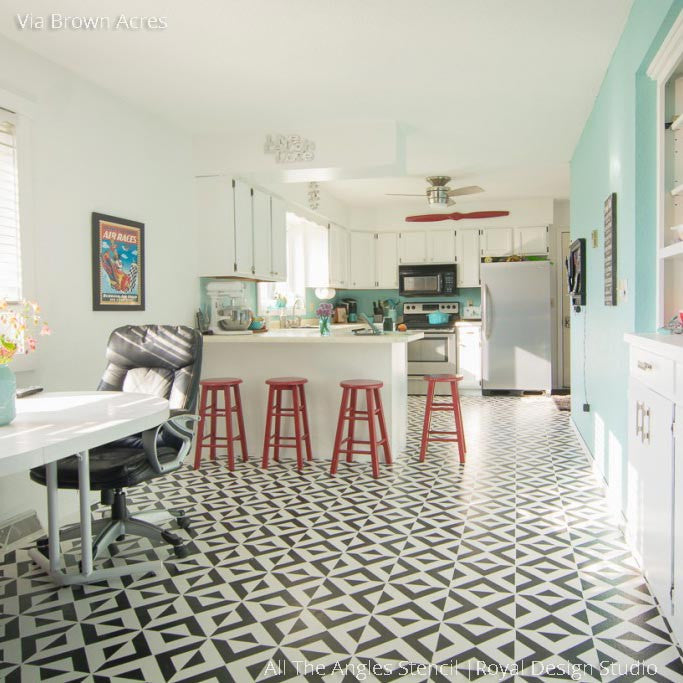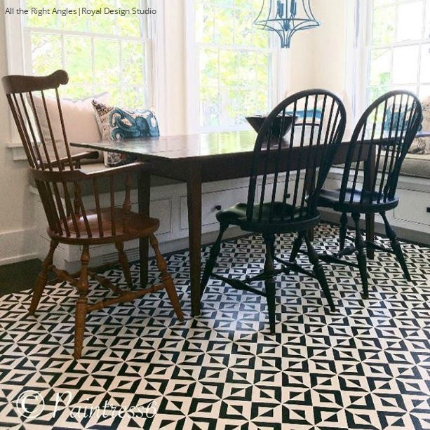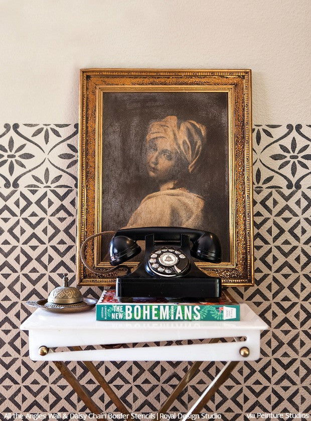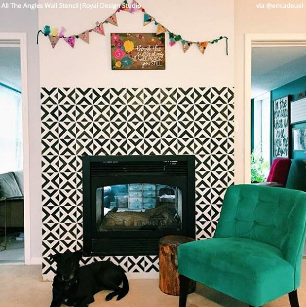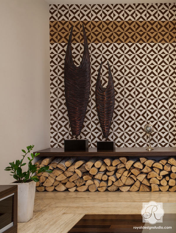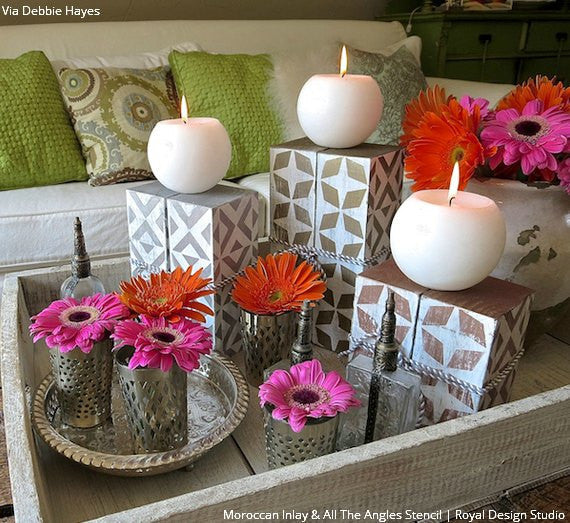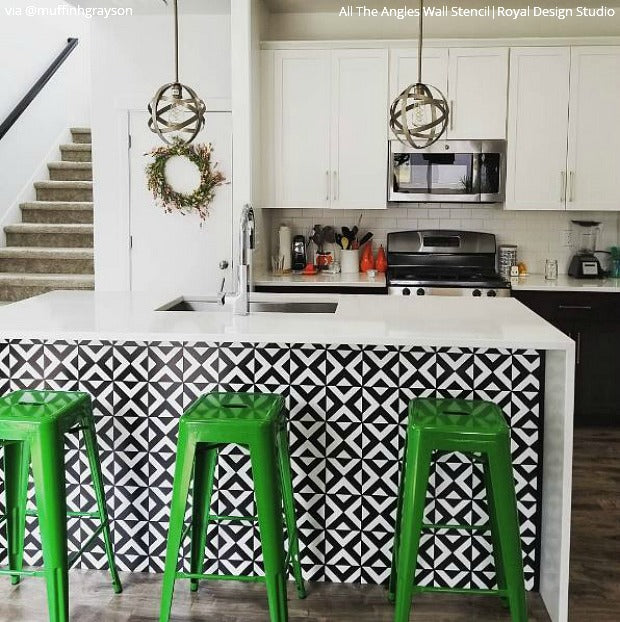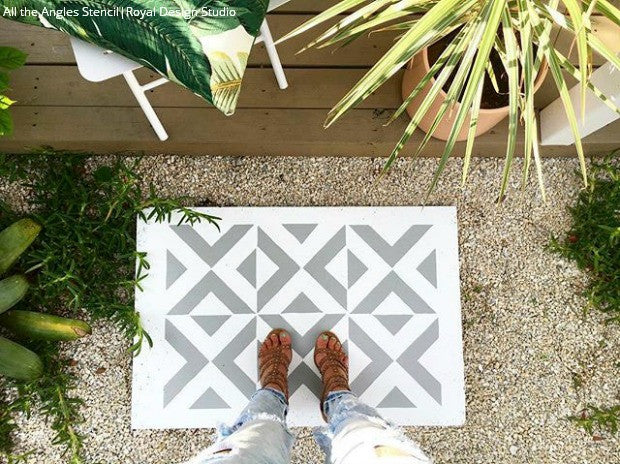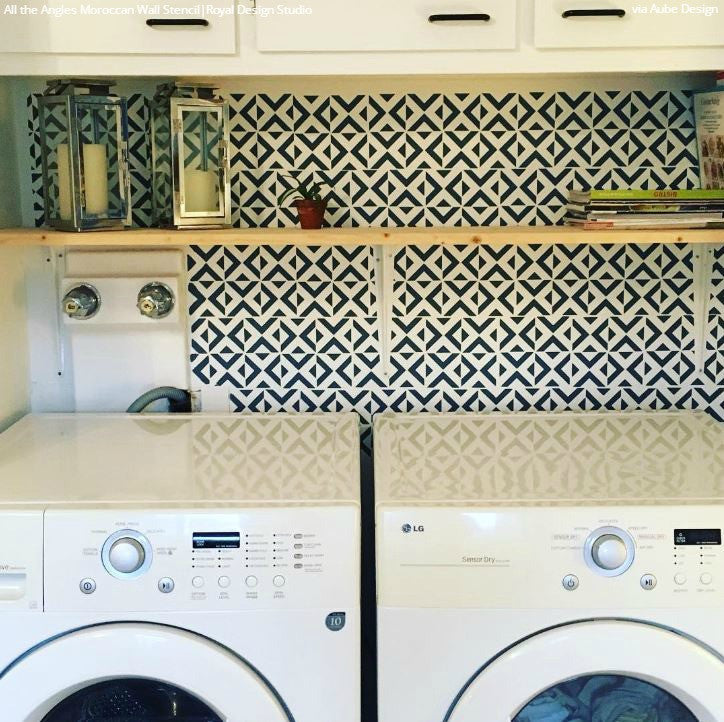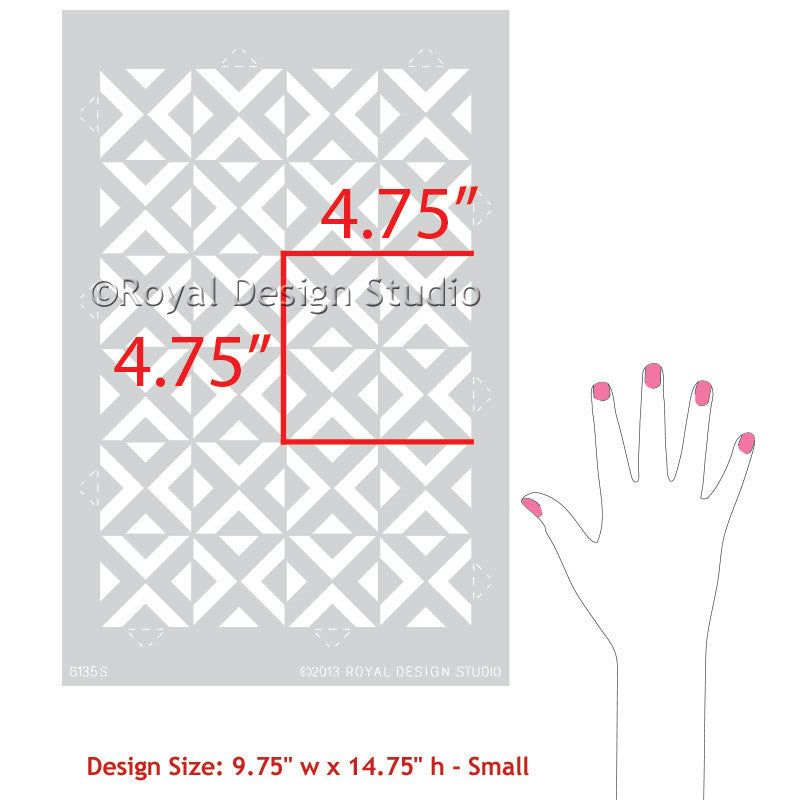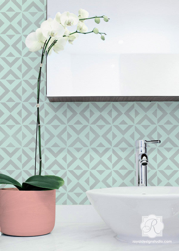 Our All the Angles Moroccan Wall Stencil is a great modern, Moroccan-inspired, geometric stencil pattern. With tile elements reaching almost 10 inches in the large size, this triangle allover pattern can be used as floor stencils for a faux tile design. The medium size helps you achieve a Wallpaper effect on any wall you stencil it on. Large, 5 inch tile shapes can be easily painted in various colors, or paint a stripe of color as a base for an interesting focal point to your finished wall. Both include a FREE ceiling filler element for easy stenciling at the ceiling line. To decorate small DIY projects with a similar look, use our All the Angles Moroccan Craft Stencil.