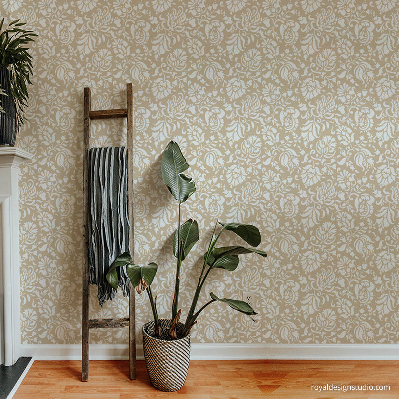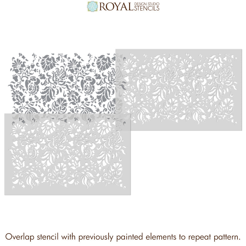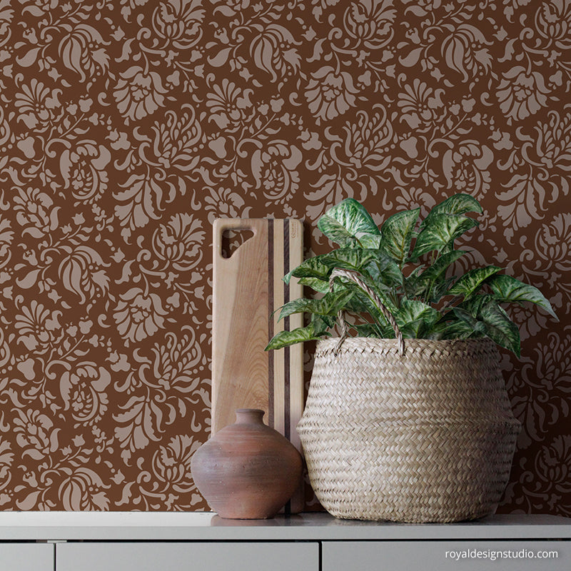 Our Allover Brocade Wall Stencil is perfect for a floral design on a feature wall, bedroom wall, or kitchen floor. Use our Allover Brocade Furniture Stencil for painted furniture.