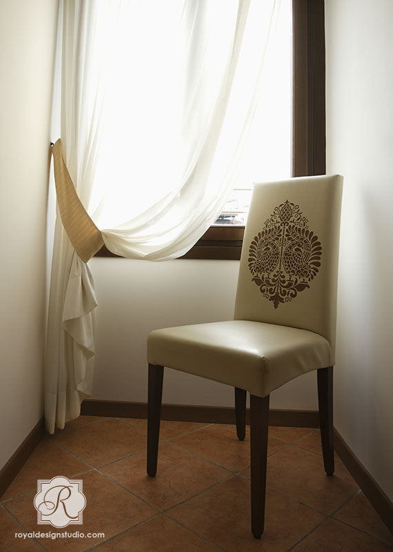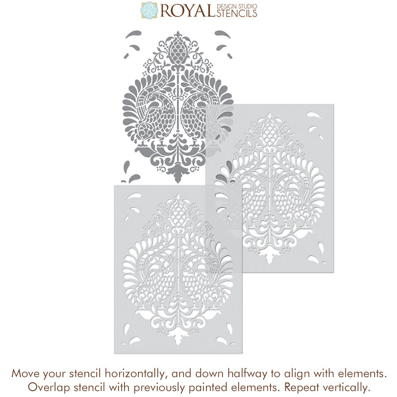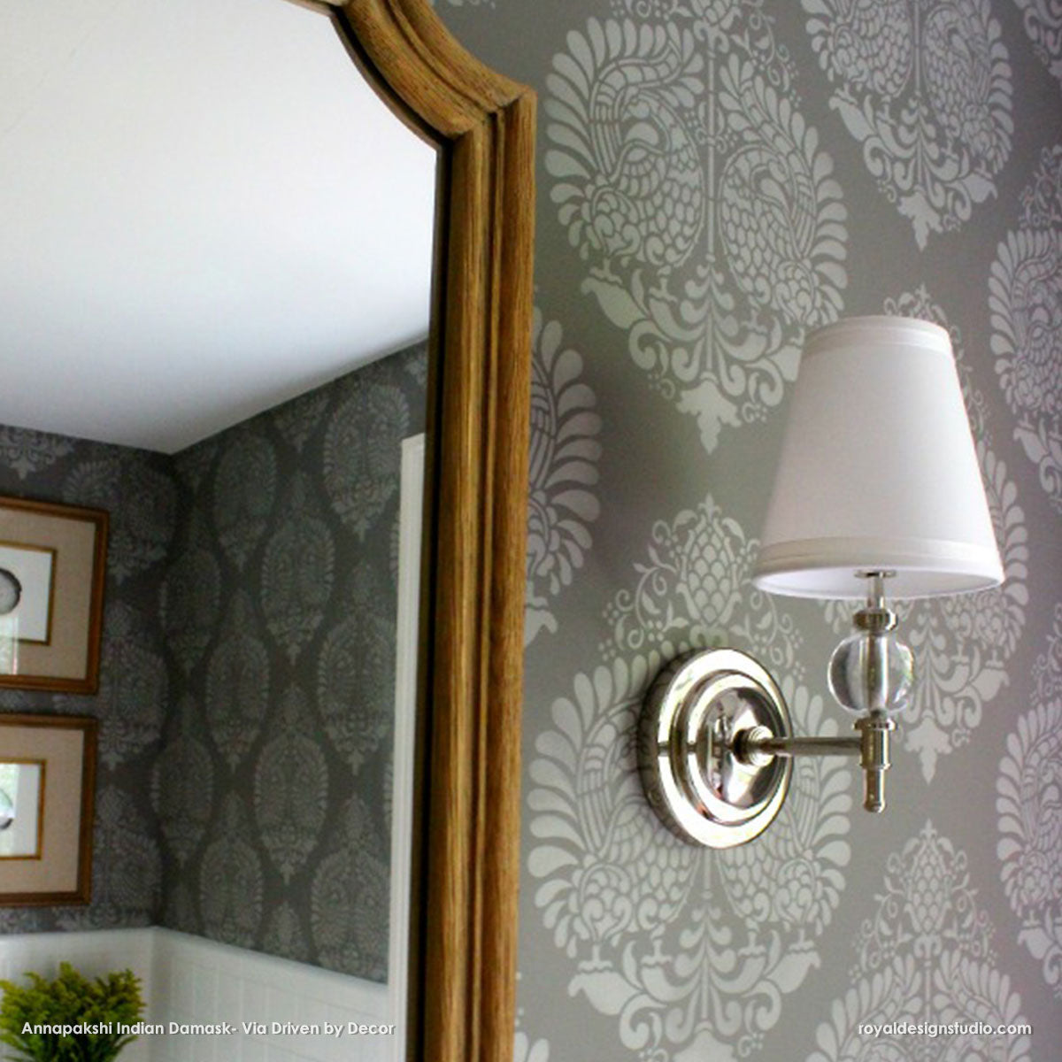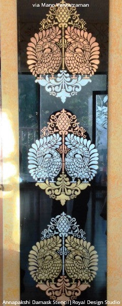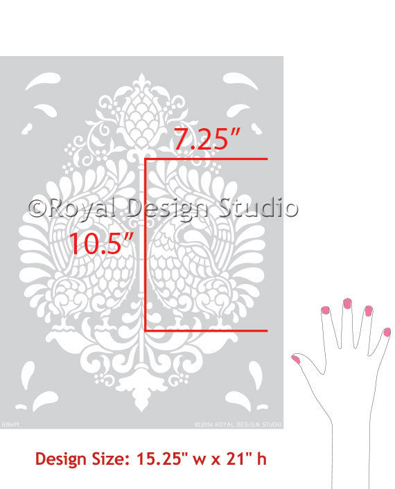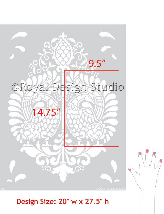 Inspired by a beautiful mythological bird symbolizing divinity, purity, and beauty, our new Annapakshi Indian Damask Wall Stencil will be sure to create an Indian oasis out of any room you paint it in. Cut as a single motif, this Indian-inspired bird stencil includes registrations for easy stenciling as an allover damask pattern. It is also available as a small Annapakshi Indian Damask Furniture Stencil for painted furniture and smaller designs.