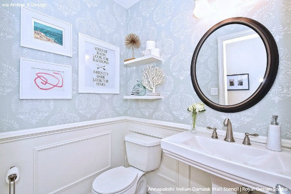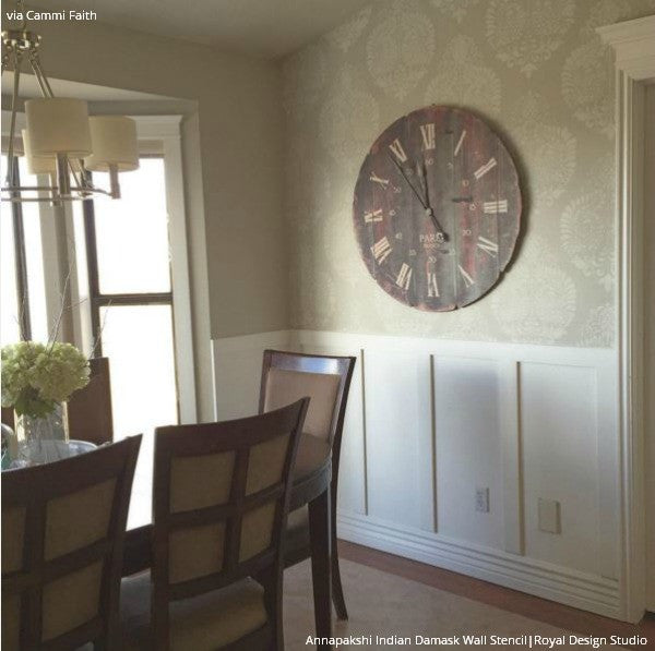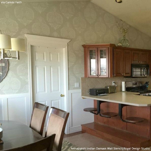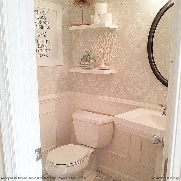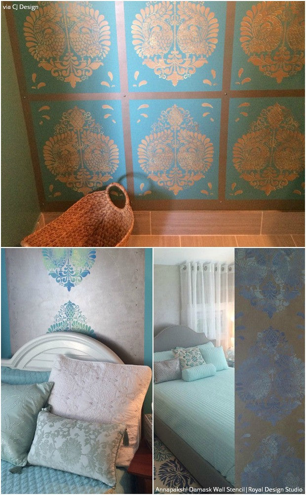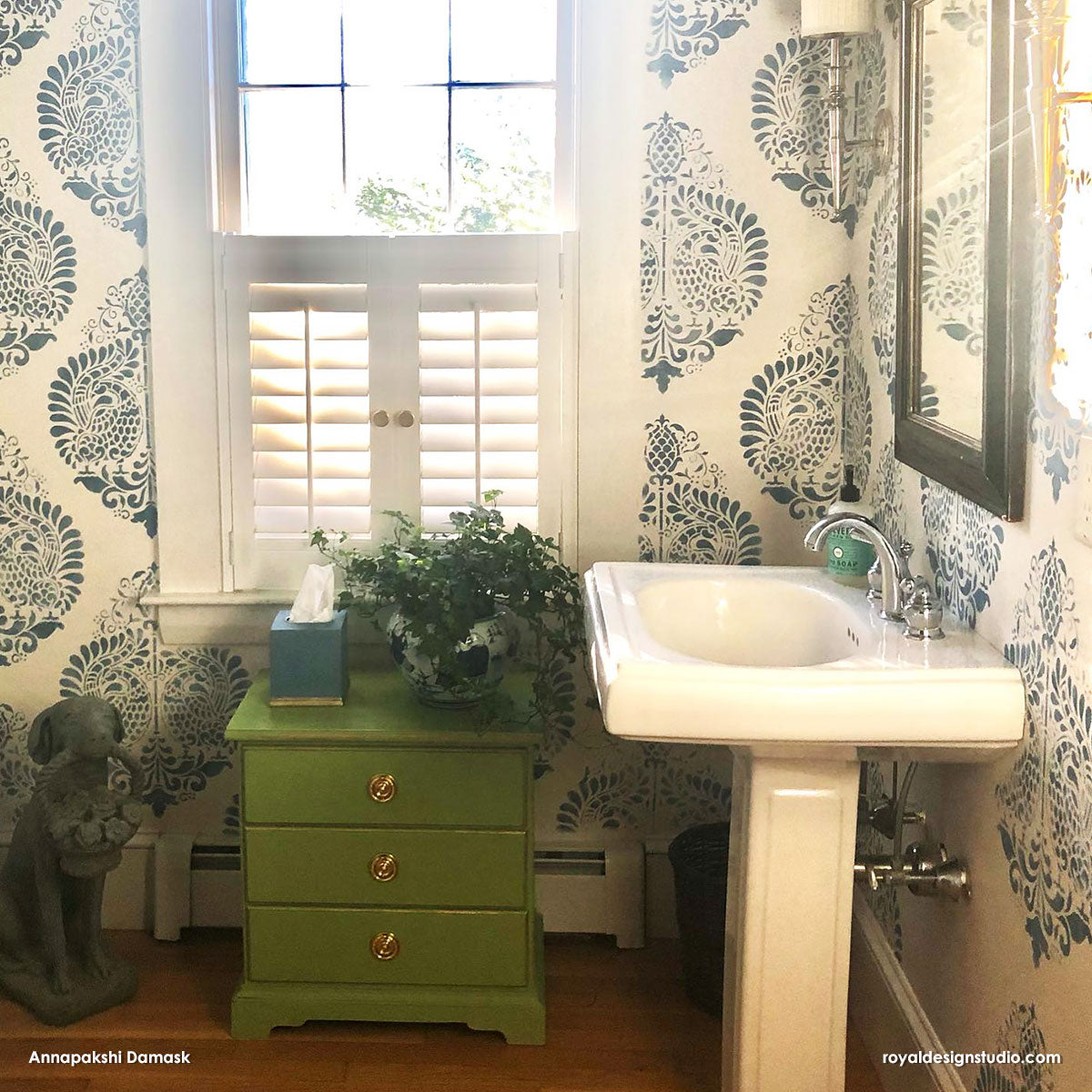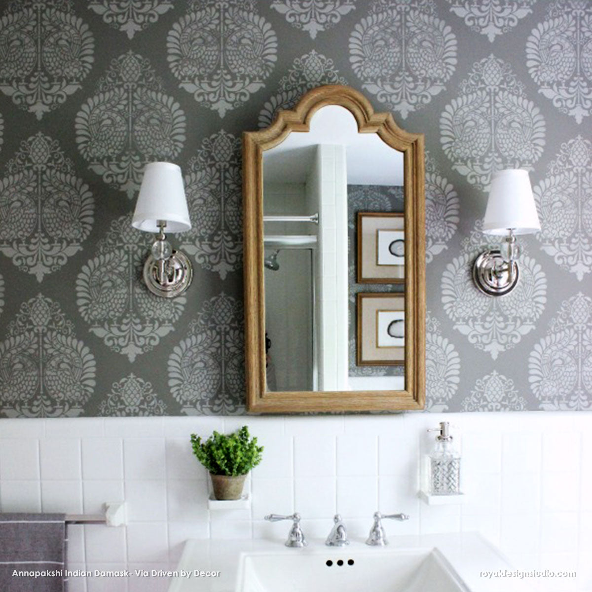 Inspired by a beautiful mythological bird symbolizing divinity, purity, and beauty, our new Annapakshi Indian Damask Wall Stencil will be sure to create an Indian oasis out of any room you paint it in. Cut as a single motif, this Indian-inspired bird stencil includes registrations for easy stenciling as an allover damask pattern. It is also available as a small Annapakshi Indian Damask Furniture Stencil for painted furniture and smaller designs.