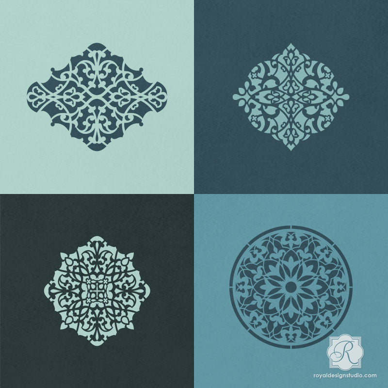 For a beautiful stencil project that showcases a variety of intricate Moroccan designs, use our Arabesque Ornament Craft Stencil Set. Paint these exotic patterns on wall art, fabric, or table decor for a cohesive and elegant look. This set includes the Asma Ornament Craft Stencil, Amira Ornament Craft Stencil, Alhambra Ornament Craft Stencil, and Alcazar Ornament Craft Stencil.