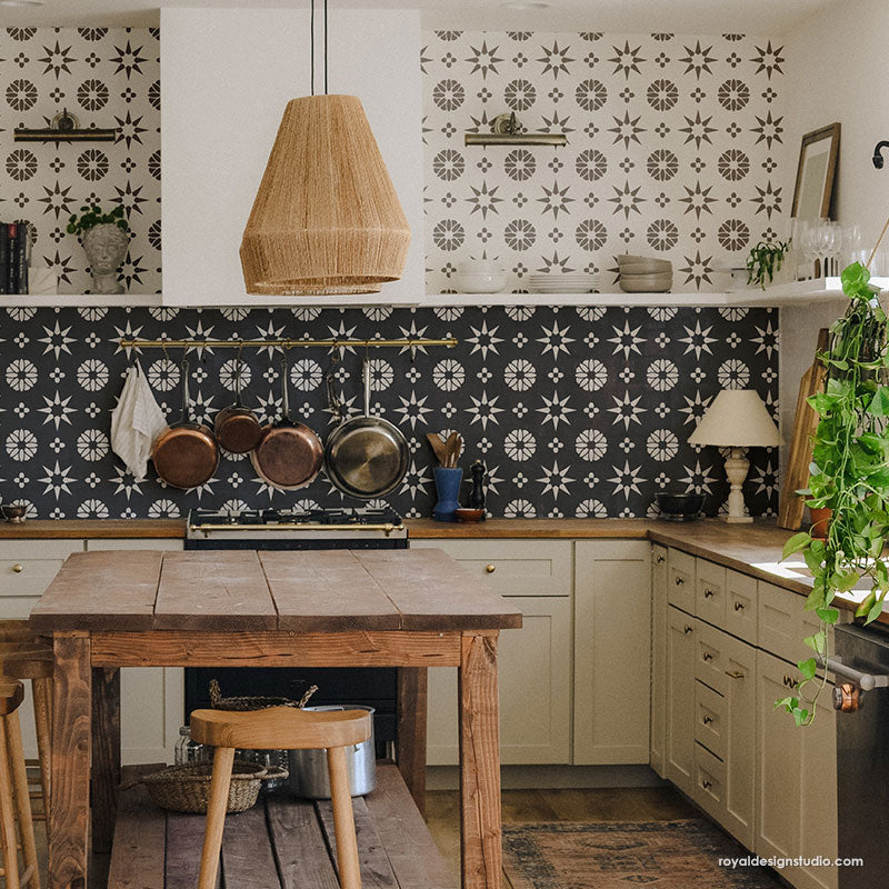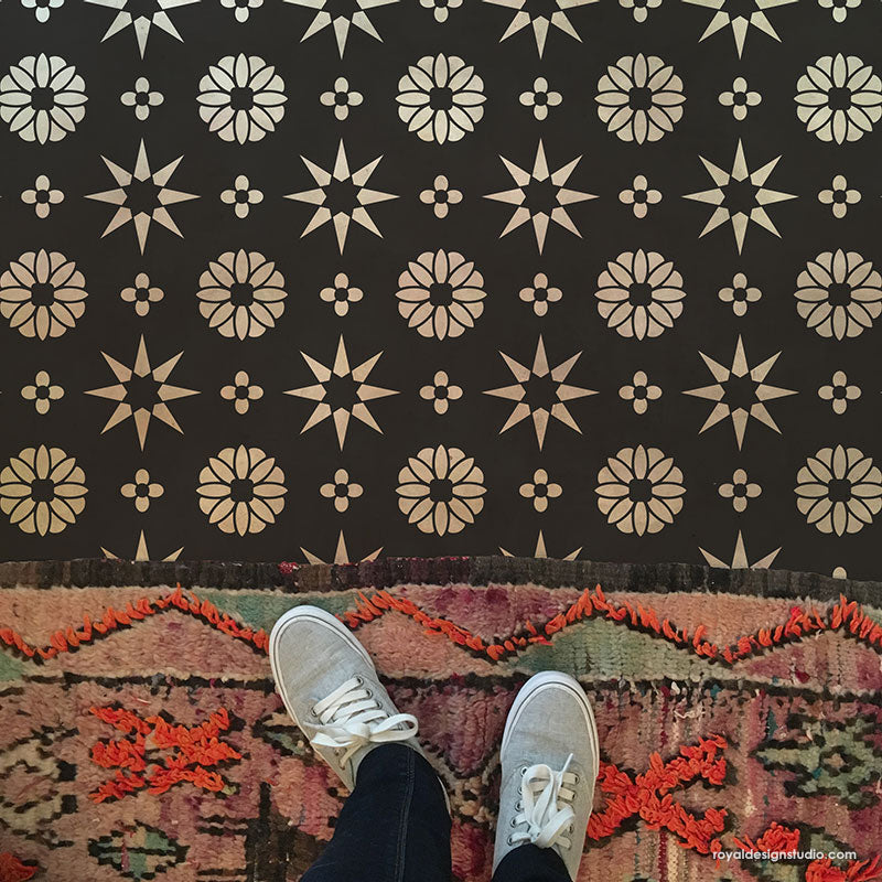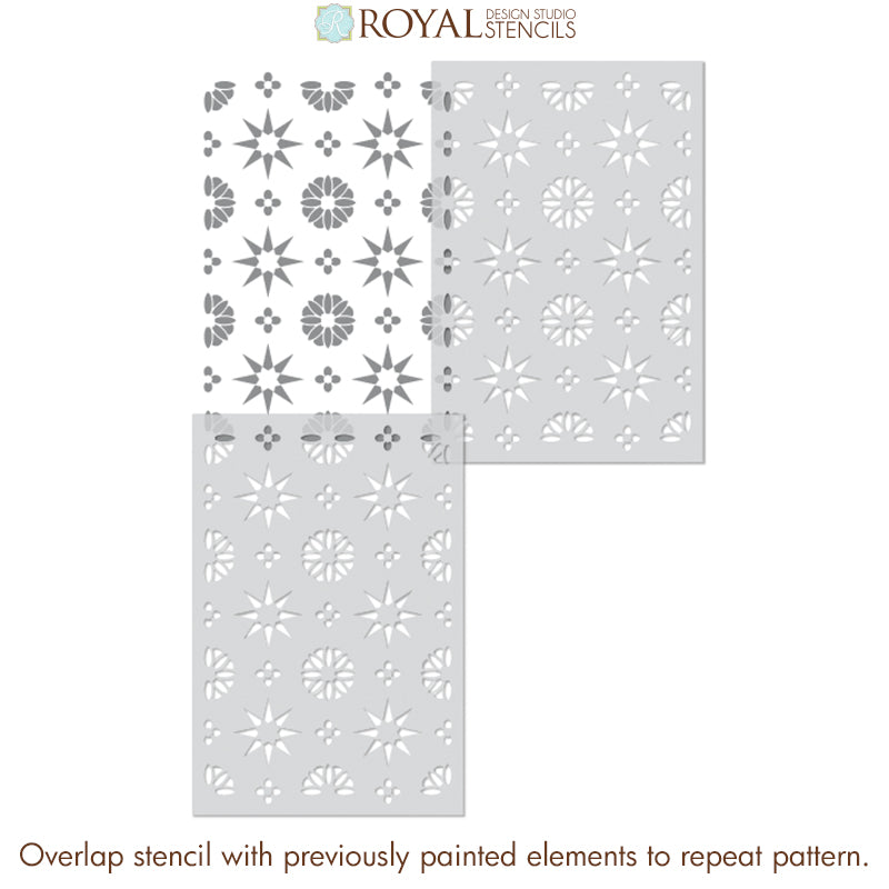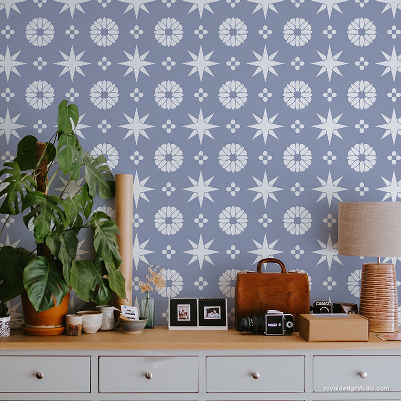 The Astro Stars Allover Stencil combines a popular star motif with a flower accent to create a whimsical stenciled pattern on walls and floors. Keep it “stencil simple” by stenciling with just one color or add in accents of different stencil colors to create a custom effect. We also love this stencil pattern with the colors reversed on different wall areas, as we show in our stenciled kitchen inspiration photo.