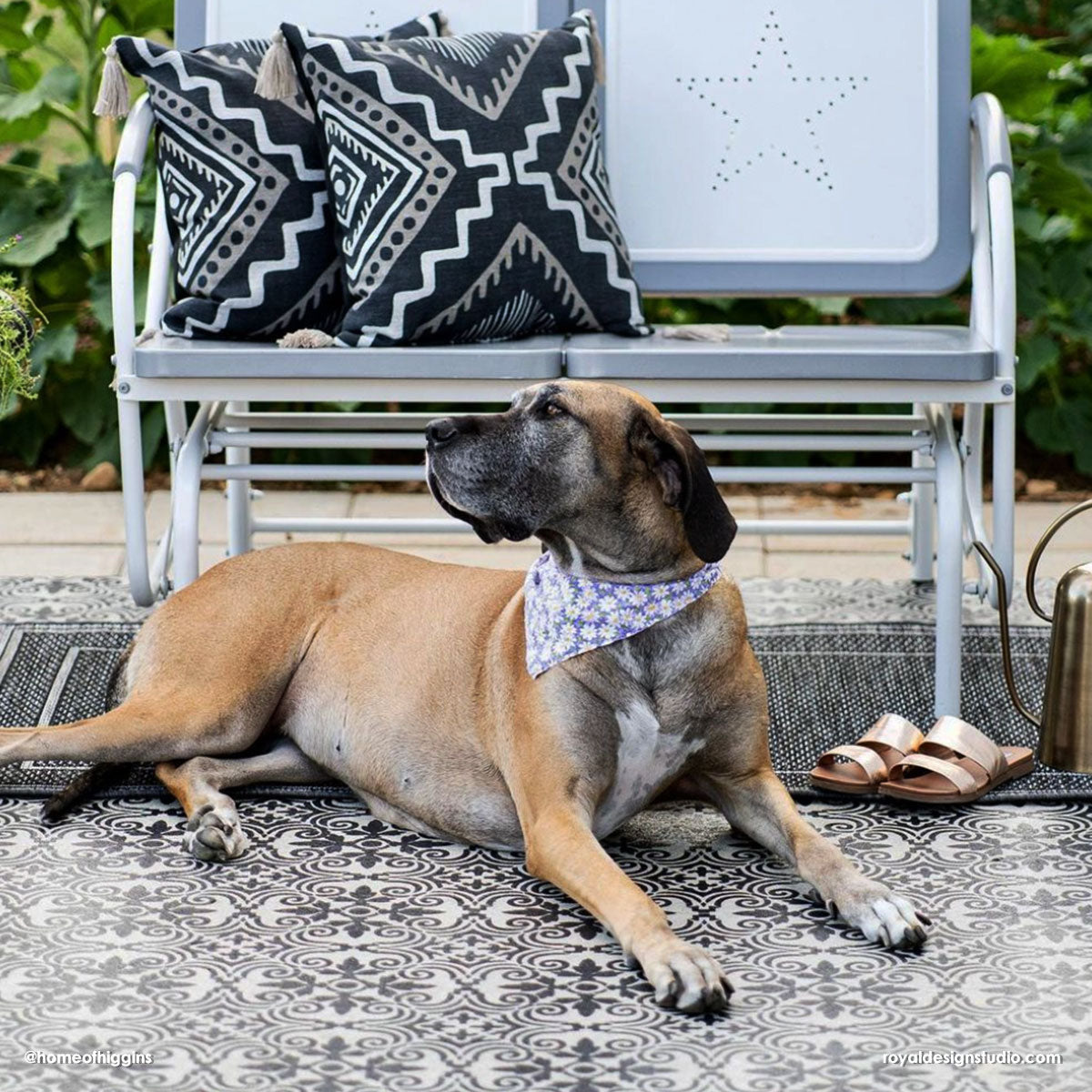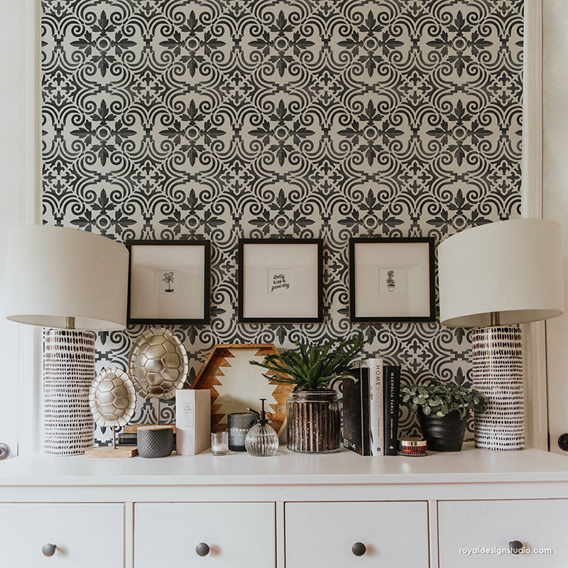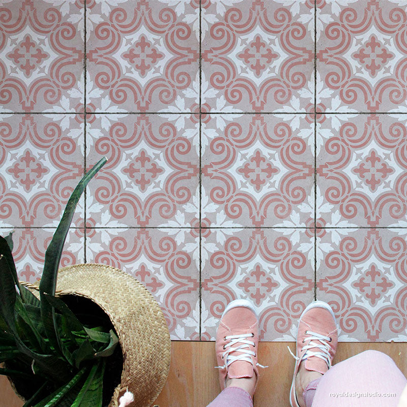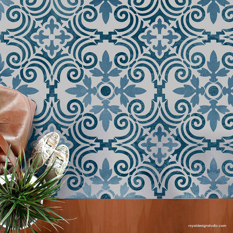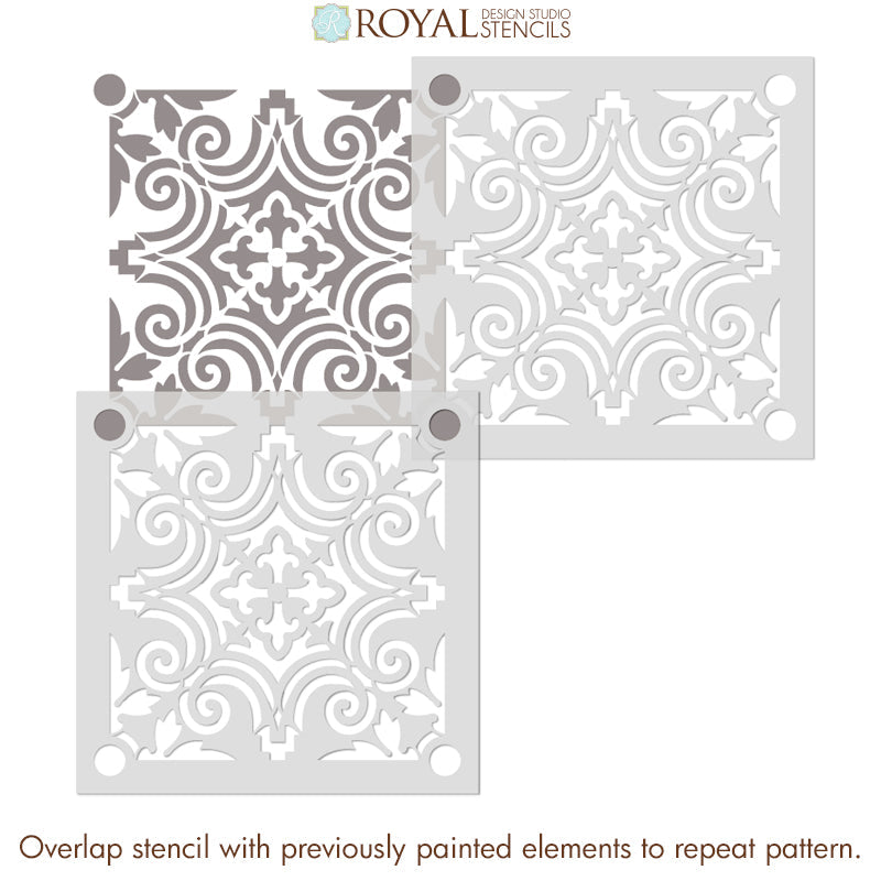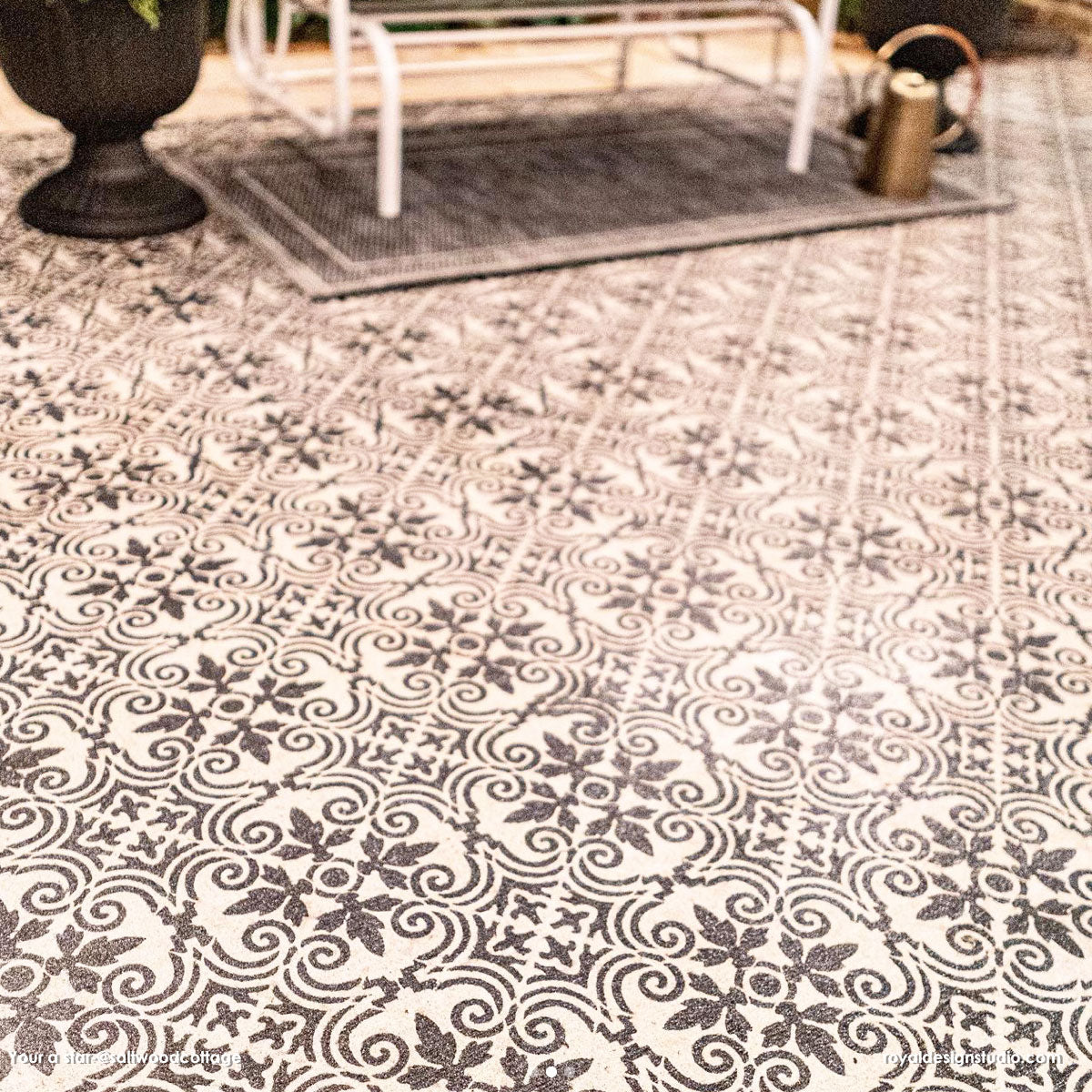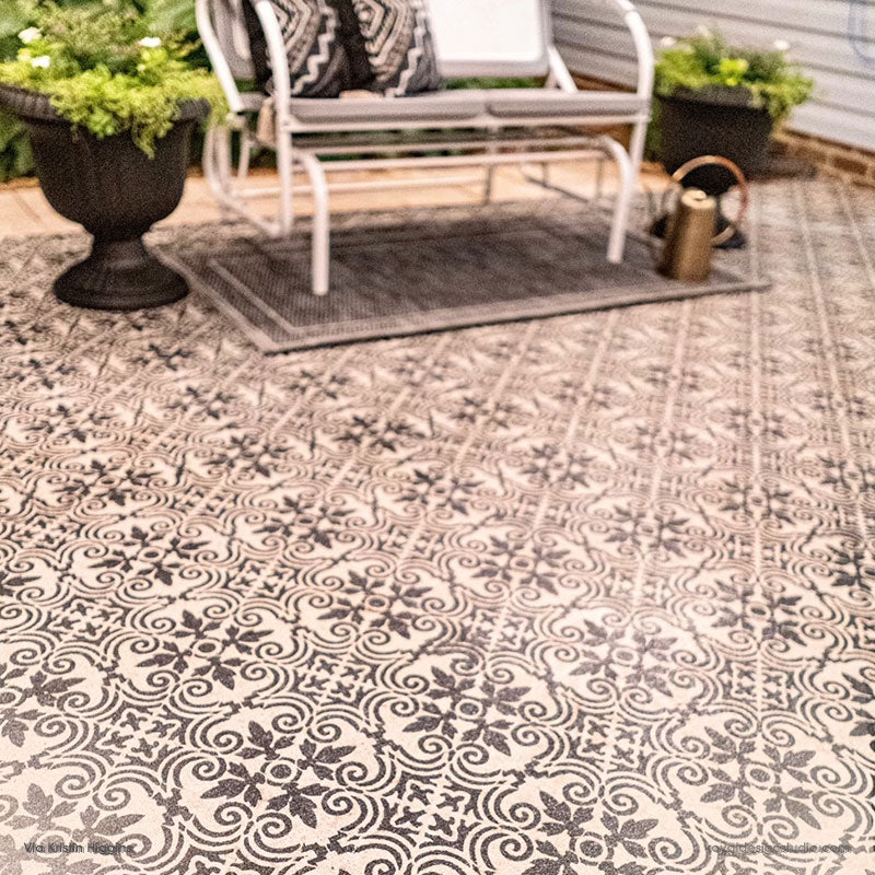 Decorate a concrete porch (or any smooth surface) the easy and affordable way with the Augusta Tile Stencil. With just outdoor porch paint and a Royal Stencil Brush, you can create the look of DIY tiles on your patio floor. To stencil a wall or floor super fast, use the Augusta Tile Allover Stencil, which features multiple repeats of this tile design.