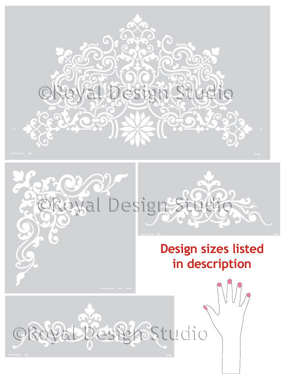 The complete Avignon Ceiling Stencils Set includes all 4 stencils and a 1/2 of a stencil pattern for rotations from this collection at a reduced price to create a coordinated stenciled ceiling.