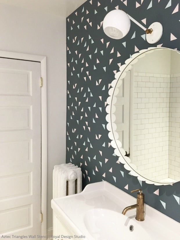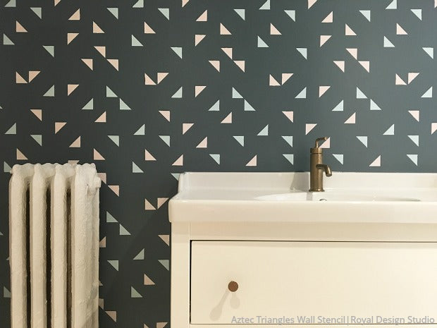 Our Aztec Triangles Wall Stencil is inspired by the natural beauty of African and tribal design with a random pattern geometric shapes that makes it perfect for a modern accent wall. Let your imagination run wild by pairing contrasting colors with this geometric triangle design! Pattern is available in a smaller scale: Aztec Triangles Furniture Stencil and Aztec Triangles Craft Stencil
