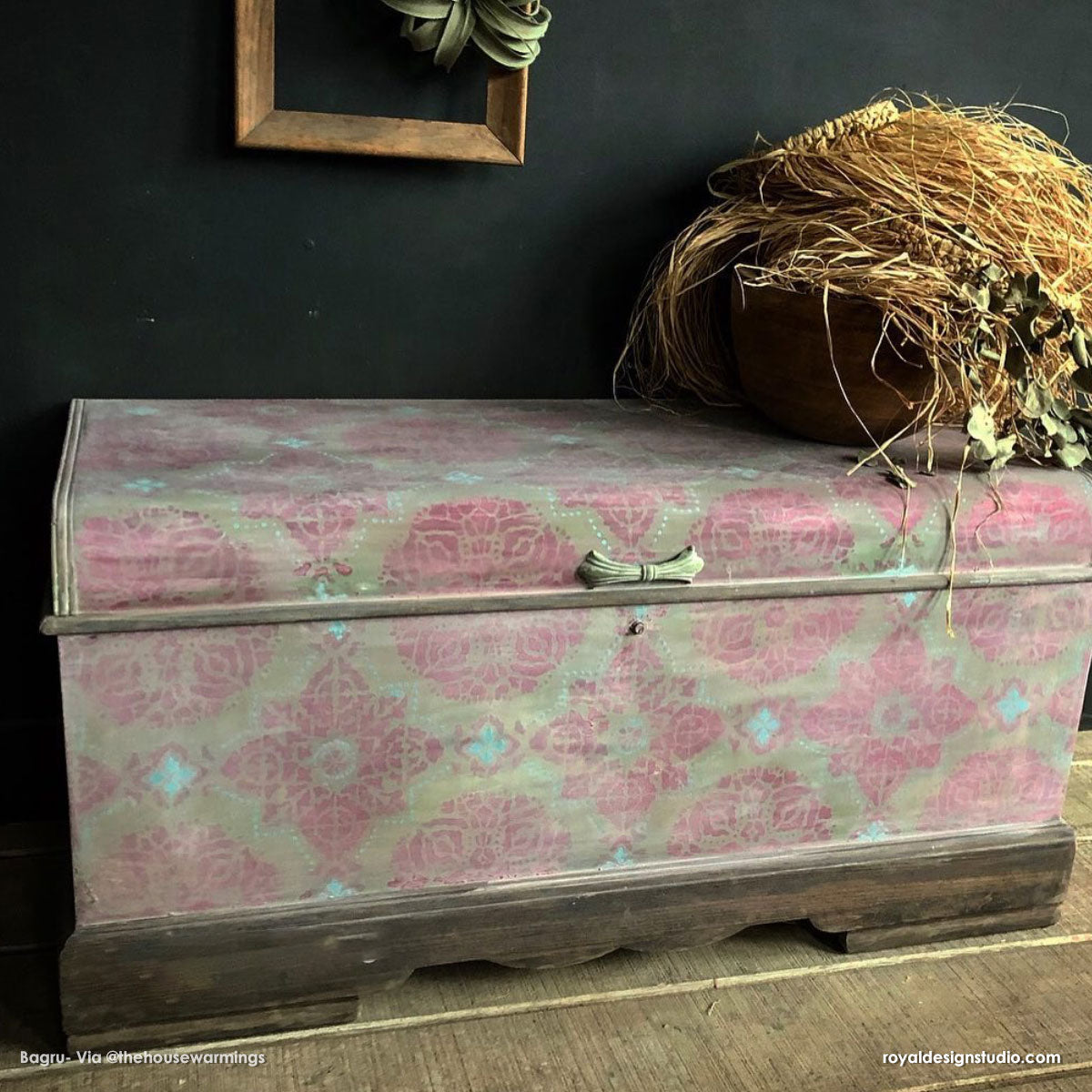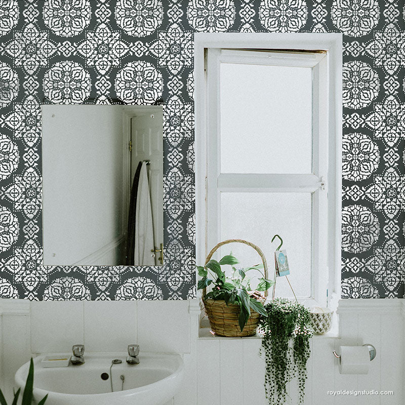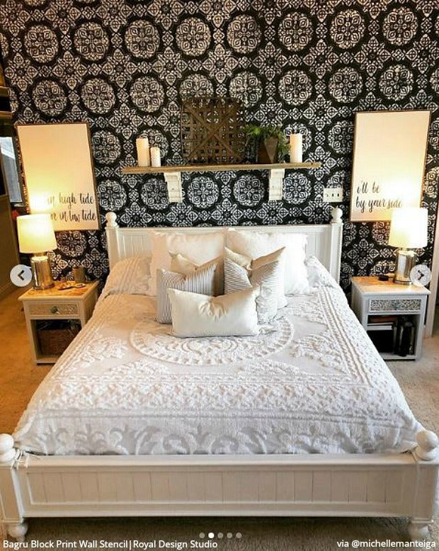 Give your bedroom wall or bathroom floor a much-needed makeover with bohemian decor and Indian style design. You can paint your own boho design with the Bagru Block Print Tile Stencil as a fast and easy DIY project... even if you are a beginner! To stencil a wall or floor super fast, use the Bagru Block Print Allover Stencil, which features multiple repeats of this tile design.