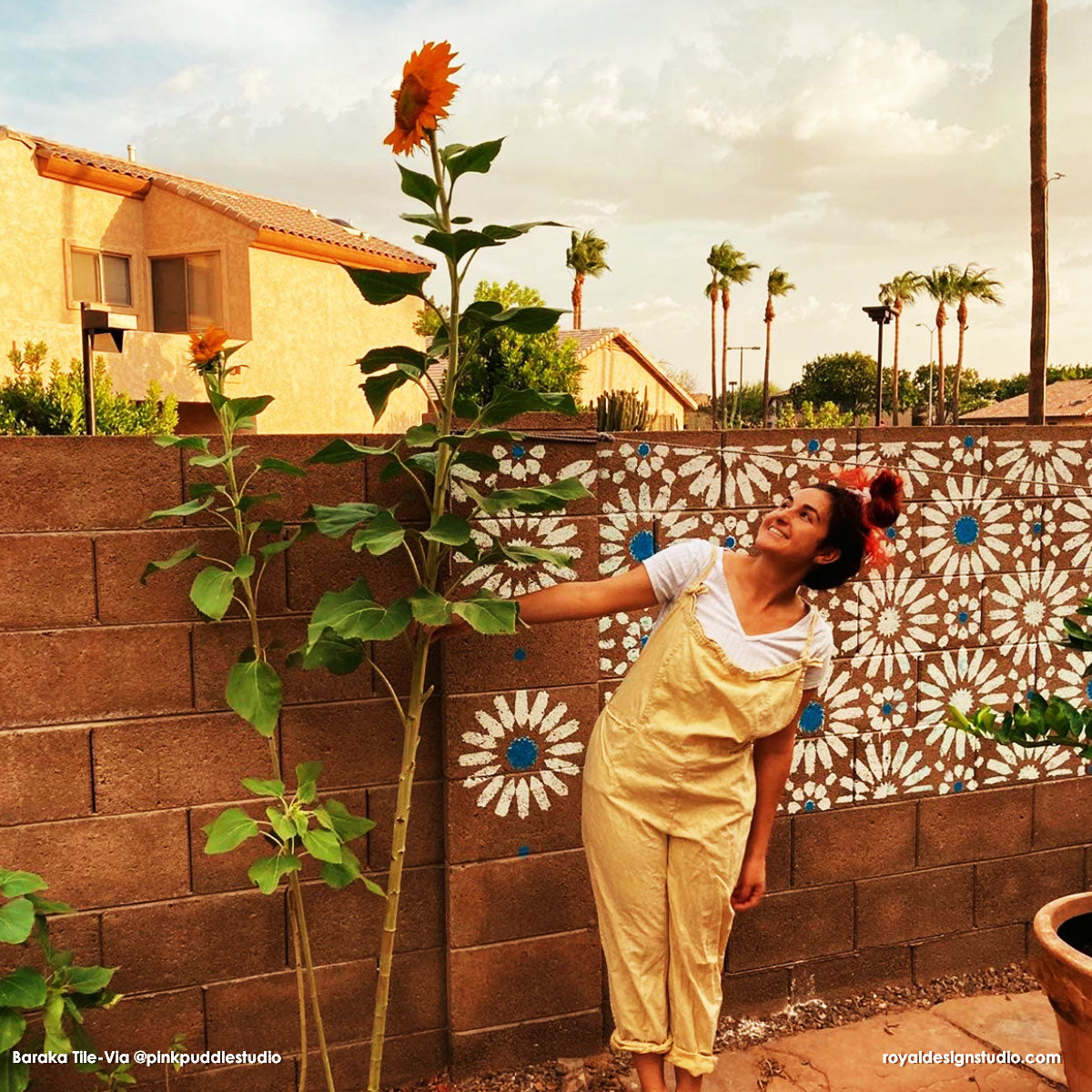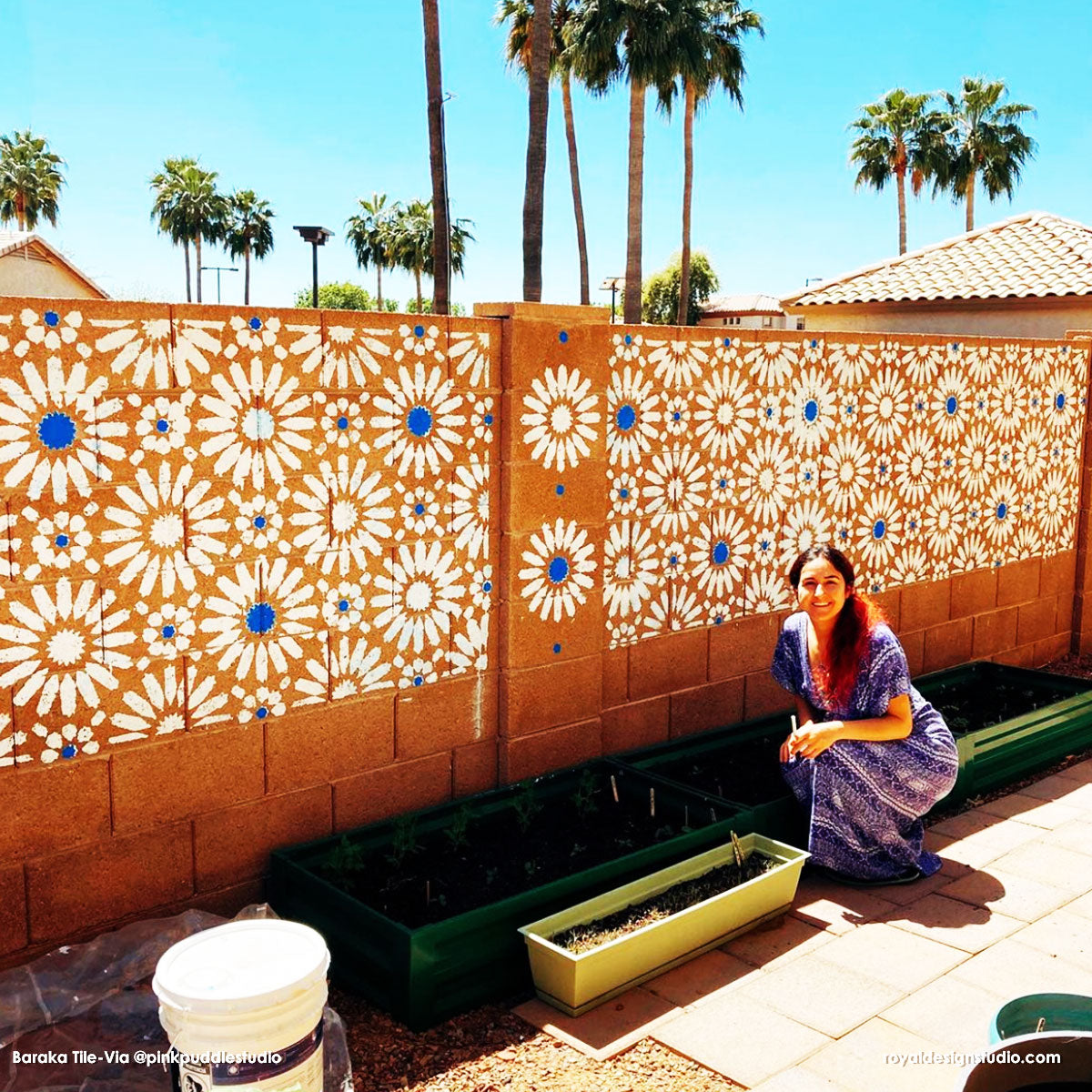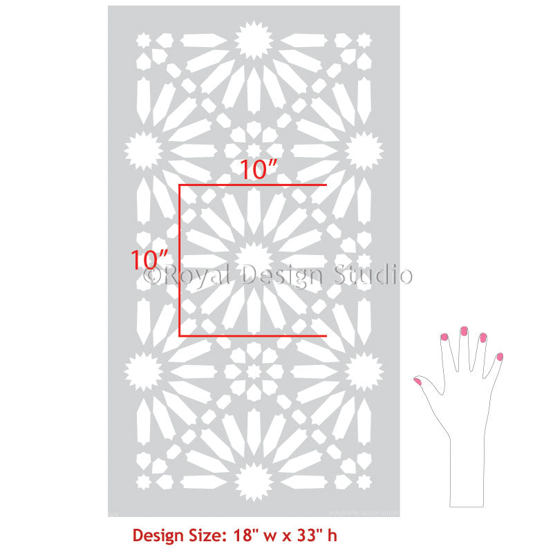 The Baraka Tile Allover Wall Stencil is sized perfectly for painting a large feature wall or kitchen backsplash with the classic European and Spanish tiles look. This large stencil includes multiple tile repeats making it fast and easy to complete a wall or floor. Each tile design in this allover stencil measures 10 inches. Use the smaller Baraka Tile Stencil to paint your individual bathroom floor tiles.