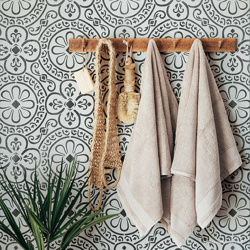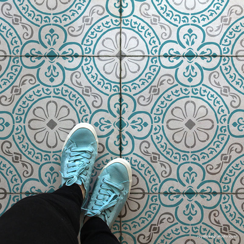 With just a Royal Stencil Brush and concrete paint, you can easily transform your patio into something beautiful. The Bixby Tile Stencil can be painted onto any surface, including a concrete porch that desperately needs a large tile floor design.