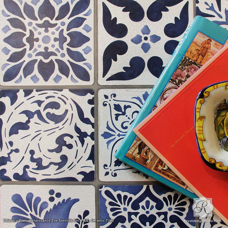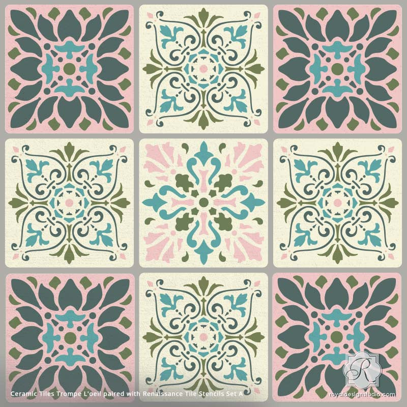 Our Ceramic Tiles Trompe L'oeil Wall Stencil includes six 6" square tiles to create an allover wall mural stencil pattern, plus fallouts for trompe l'oeil shading. Stencil Options! Create a traditional border around this tile stencil with our Mosaic Tile Classic Border Stencil. You can also use our Renaissance Tile Stencils Set A and Renaissance Tile Stencils Set B to create a patterned faux tile look. Want more of an exotic loo? Use our Talavera Tiles Stencils to add Latin American pattern to your table or kitchen backsplash.