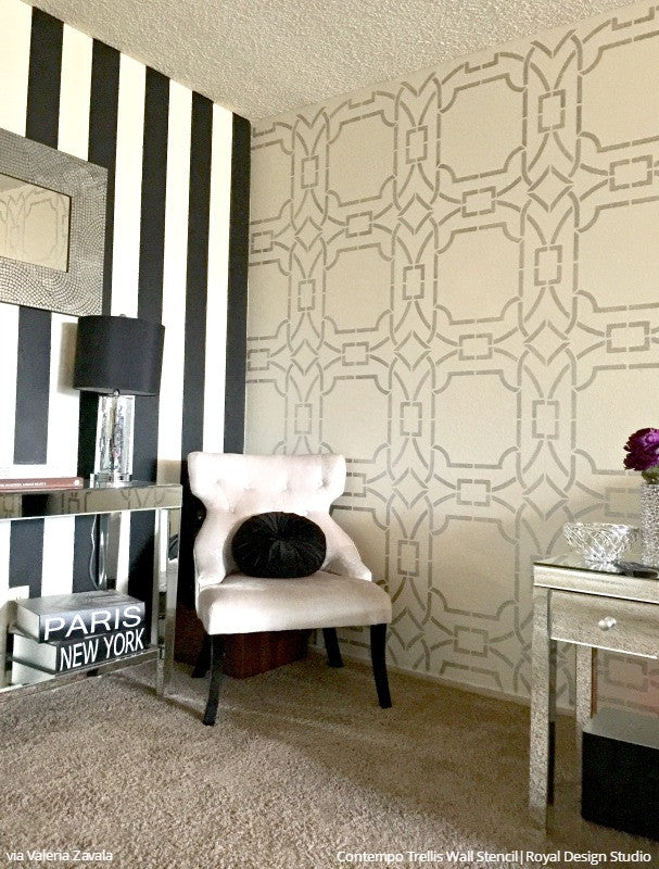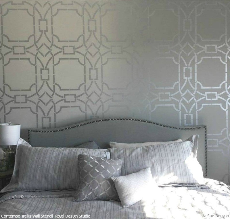 Here's our most popular modern and geometric wall stencil, the Contempo Trellis! Perfect for stenciling an accent wall, ceiling or floor in the color of your choice. You can get the wallpaper effect with wall stencils and the painted rug design with floor stencils! Take control of your style, your colors, your budget - all without ruining your walls! Check out how our Contempo Trellis craze in contagious!