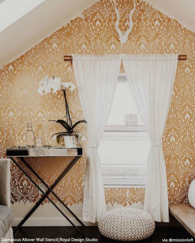 Whenever we think of “gypsies” we think of glistening gold! Take the exotic wallpaper look of our Damascus Allover Wall Stencil and paint this ornate, sumptuous pattern on your accent wall!
