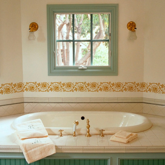 A border stencil can be perfect for adding just the right touch of color and design to spark up a plain wall. Check out how our Elegancia Border Stencils warms up this decorated bathroom wall. If you wanted to add more pattern, this design coordinates with our Elegancia Allover stencil.