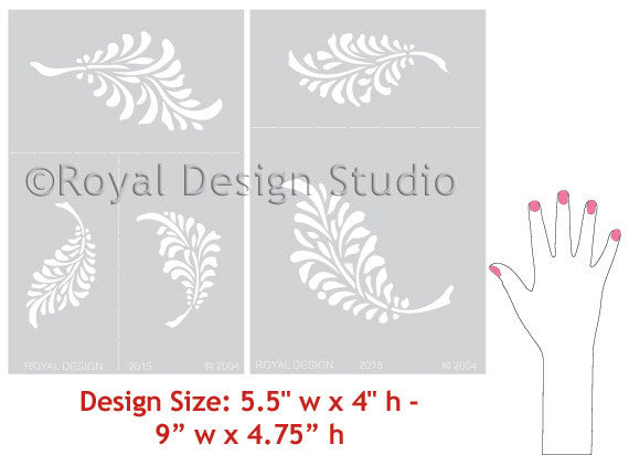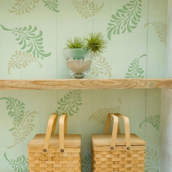 Another area to try a wallpaper effect with stencils in on the back wall of an open bookshelf or china cabinet. Here, the Falling Feathers Wall Stencil is perfect for creating a casual, yet custom effect. This is another fun stencil for scattering across a wall, but would be great on a floor, furniture, or fabric project as well. Five whimsical feather elements wall stencil designs.
