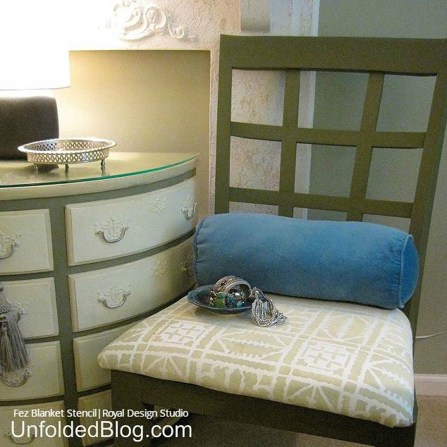 Our Fez Blanket Moroccan Stencil is inspired by the Fez blanket textiles of Morocco. Mix or Match with our other Moroccan stencils in the Fez series to create beautiful stenciled walls, furniture, floors, and stairs. See Melanie and her stencil painting team create a fabulous stenciled Moroccan tent using these designs: