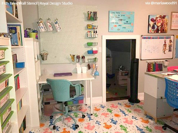 Start your little sailor off right by decorating his sea escape with our Fish Tales Wall Stencil. Just like any of our stencils, you can have a blast really putting your own creativity and spin on the pattern. You can use navy for a traditional nautical theme or use your child’s favorite colors to create a colorful water world. Stencil Idea: You can even use Royal Stencil Cremes and foil to create metallic fish scales.