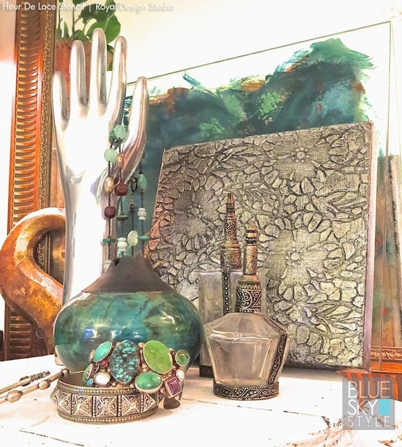 Our Fleur de Lace allover furniture stencil is a simple and delicate flower and lace pattern. This floral lace stencil is perfect to add details to painted furniture or small DIY projects. For larger feature walls or bedroom floors, use our Fleur de Lace Allover Wall Stencil.