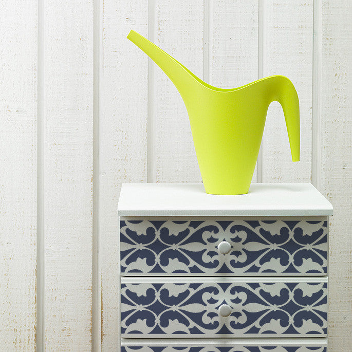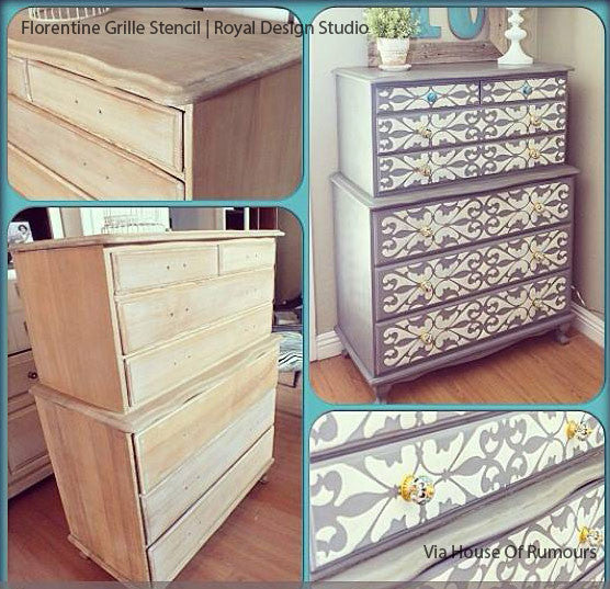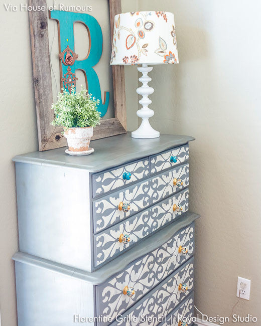 Play up your painted furniture by stenciling the Florentine Grille Border Stencils on drawers. This Italian border stencil is a reverse stencil. The featured image shown is Medium Florentine Grille Border Stencil. Check out how this border stencil is used on these stylish dresser drawers