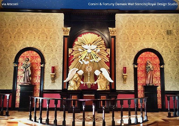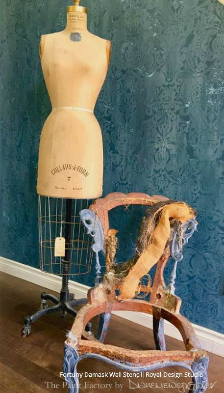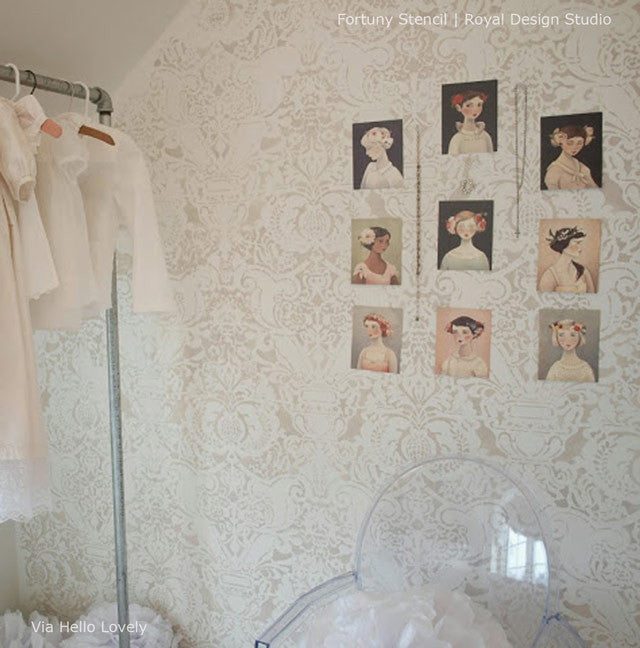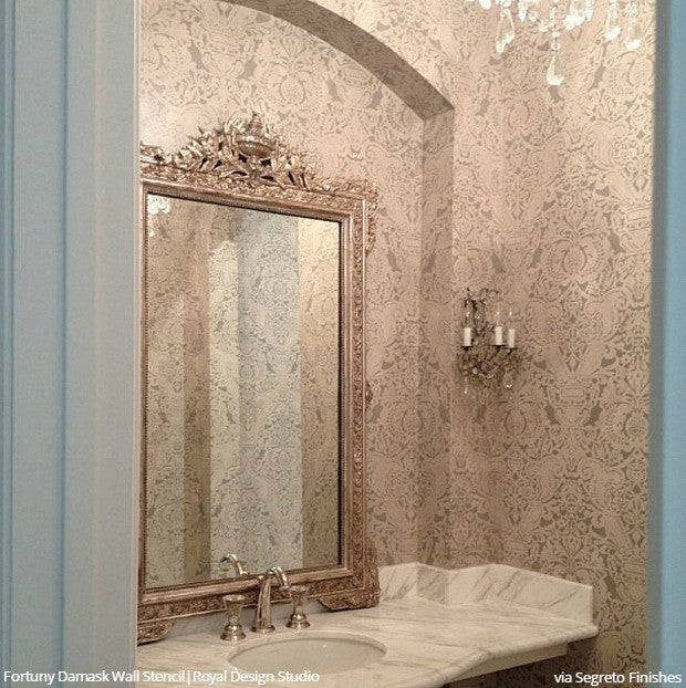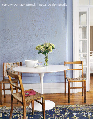 This Fortuny Wall Stencil is named because the pattern is reminiscent of ones used in the famed Fortuny silks from Italy. It is perfect for creating fabric finishes, like the subtle stria technique shown, done with solid, high contrast, or with the "lost and found" edges technique of the Faded Damask.