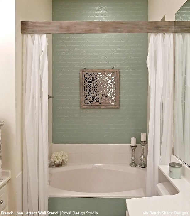 Our French Love Letters Wall Stencils with easy-to-use registration marks allow you to easily repeat across your wall perfectly every time. Create a romantic stenciled wallpaper effect of French phrases and love quotes in your bathroom or bedroom, or simply stencil an eye catching accent wall. This intricate typography stencil is perfect for either modern or vintage style room decor. For smaller DIY projects such as painted furniture or cabinets, use our French Love Letters Furniture Stencil.