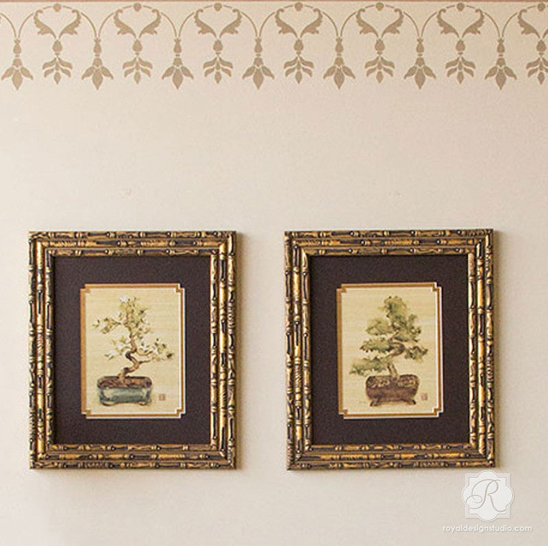 Our Grand Mughal Moroccan Border Stencil is the final touch to our Mughal Moroccan Wall and Furniture Stencils. Stencil it as a ceiling border, as shown in our images, or over a chair rail in your favorite living area coordinated with our Mughal Trellis Moroccan Wall Stencil.