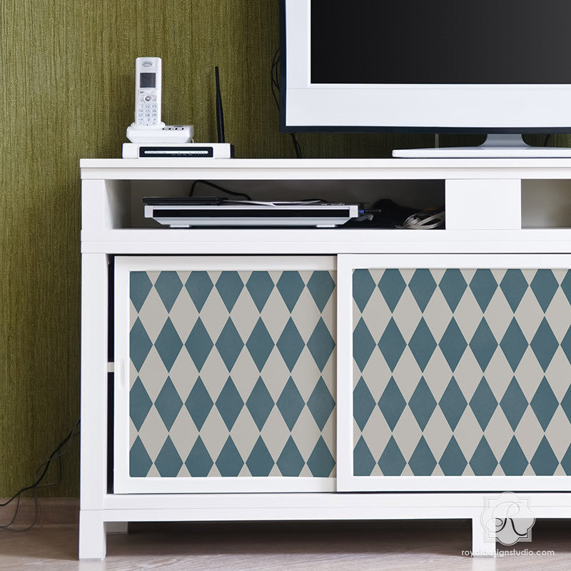 A great graphic, geometric stencil pattern that can be used for both modern or retro design. The Harlequin Furniture Stencil is a diamond Allover Pattern is a smaller pattern that is ideal for a furniture project or as a tile pattern for a kitchen backsplash and bathroom wall. The Harlequin Wall Stencil is ideal for a floor stenciling project or helping to achieve a wallpaper effect. The Harlequin Craft Stencil creates fun arts and crafts, fabric projects, and DIY canvas art.