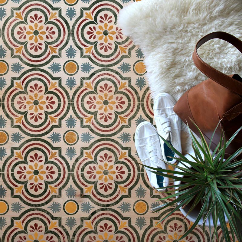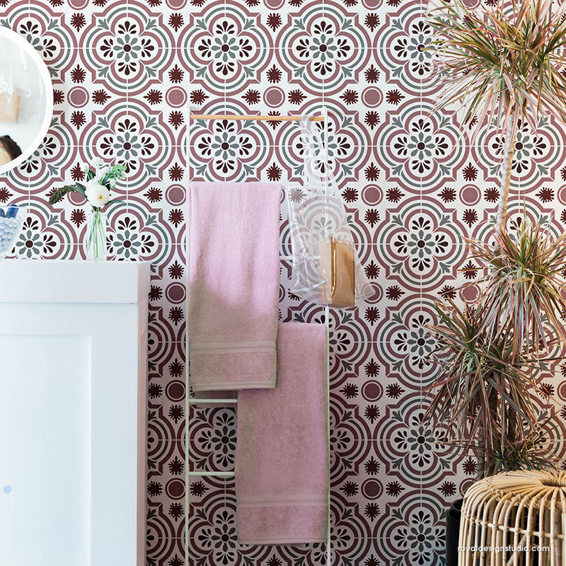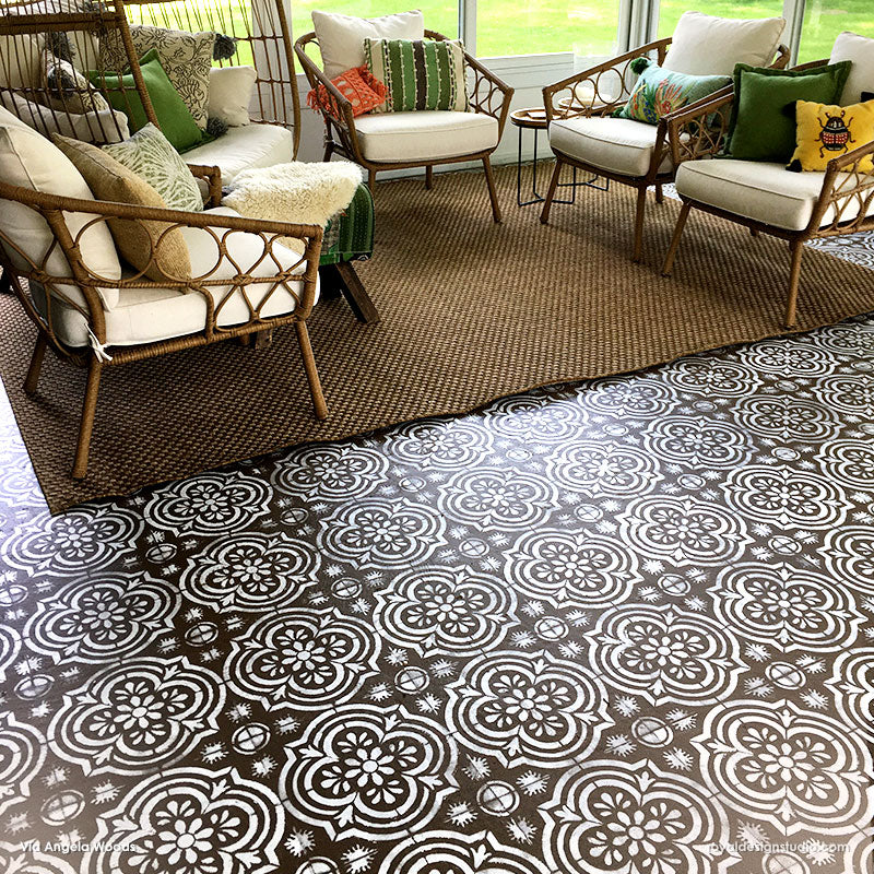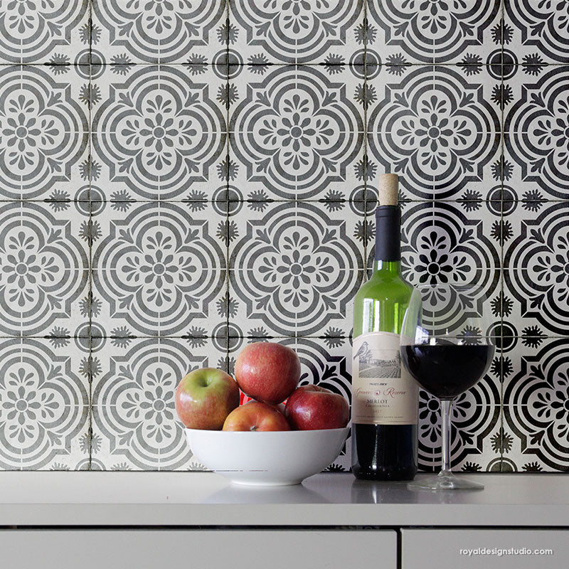 Paint the look of Spanish tiles on your bathroom floor, concrete floor, or kitchen backsplash with the Havana Tile Stencil. Stenciling this classic tile pattern saves you money from having to buy (and install!) real encaustic cement tiles. Now, that's awesome! To stencil a wall or floor super fast, use the Havana Tile Allover Stencil, which features multiple repeats of this tile design.