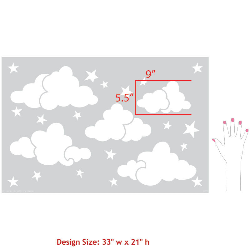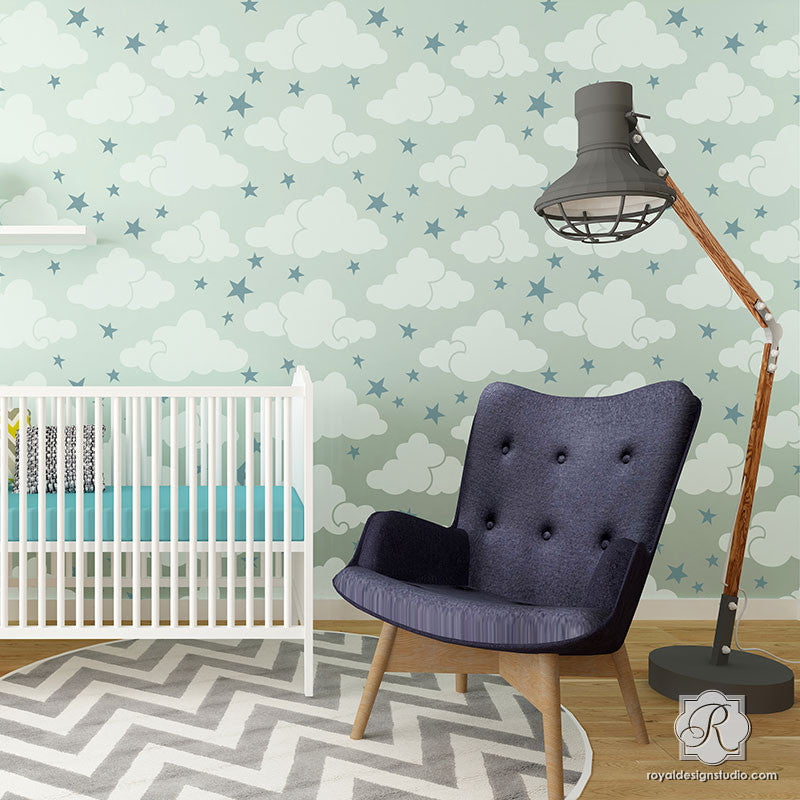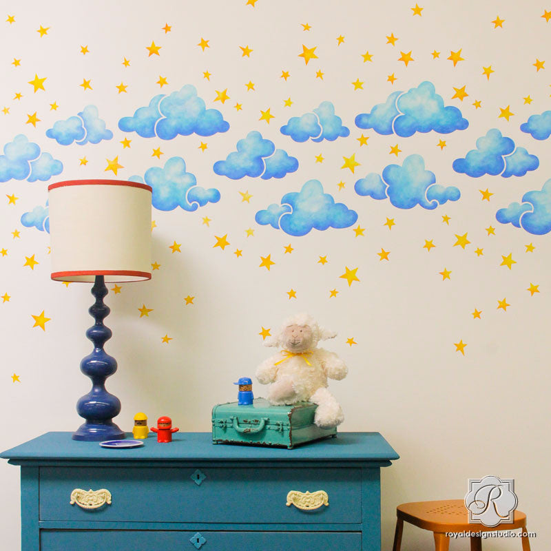 As a child, do you remember looking into the sky and seeing what shapes and stories you imagined in the clouds above you? Our Head In The Clouds Wall Stencil will give your child’s nursery the same feeling and they will be dreaming of soft clouds and twinkling stars. Paint the sky in pastels make it more realistic with shading.