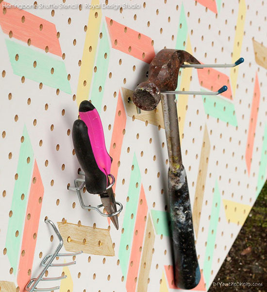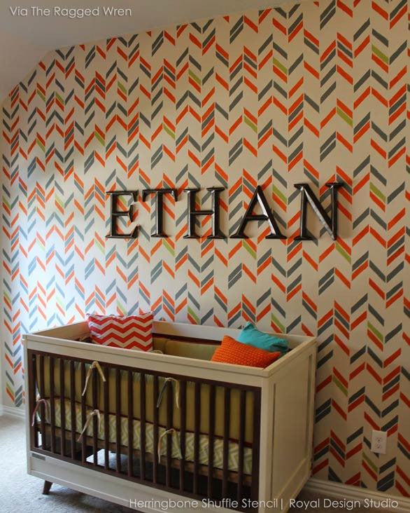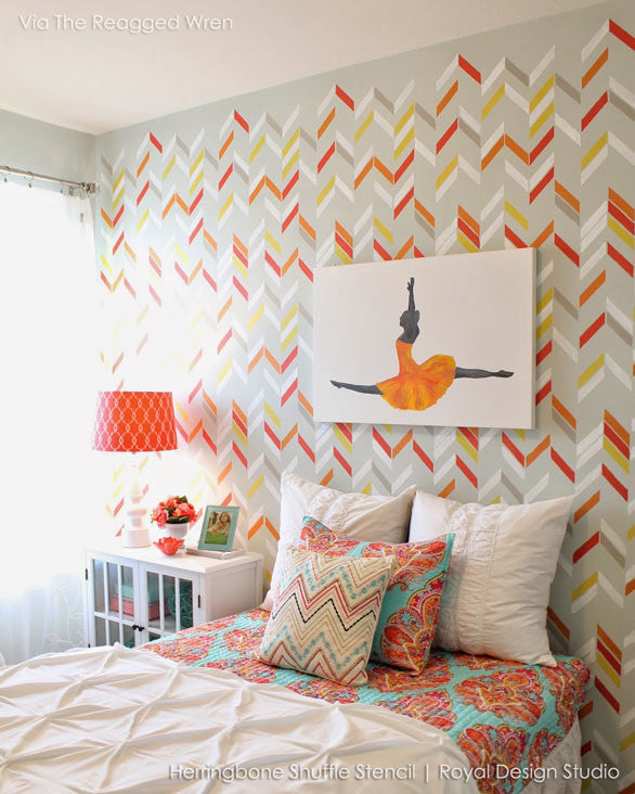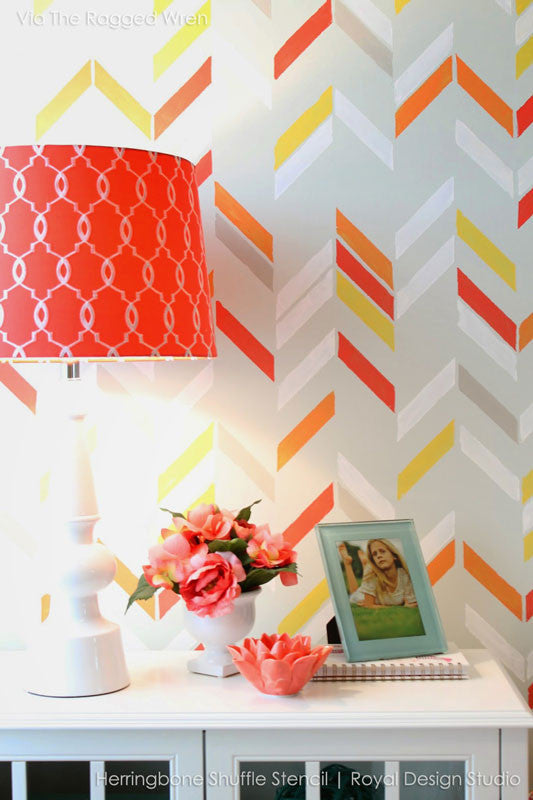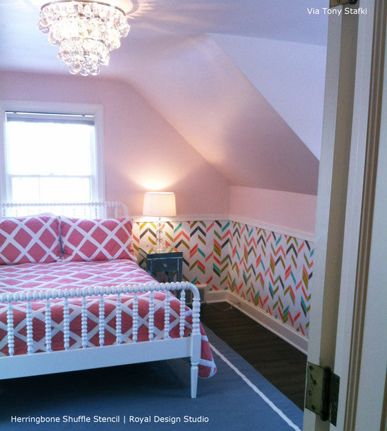A unique take on a herringbone stencil design, this Herringbone Shuffle Allover Wall Stencil from our new Bonnie Christine Stencil Collection for Royal Design Studio, combines geometric rectangular shapes with a modern feel. Ideal for contemporary interiors, you can stencil it on feature walls or as accents in the color of your choice! Check out how one of our popular stencils can create a multitude of looks! This stencil includes a FREE ceiling filler stencil element to finish the pattern easily at your ceiling line.