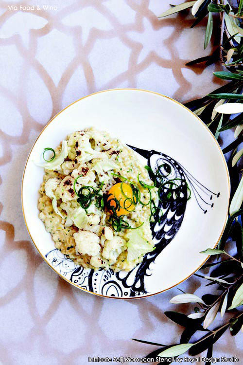 The Intricate Zelij Moroccan Furniture Stencil shown on the desk top and black door. This Moroccan design also comes in a larger wall stencil: Intricate Zelij Moroccan Wall Stencil version, as shown on the wall and large yellow door. To decorate scrapbooks and small DIY projects with a similar look, use our Intricate Zelij Moroccan Craft Stencil. Zelij designs are examples of complex radial geometric patterns used in traditional Moroccan mosaic tile, these Moroccan designs were inspired by Melanie Royal's stencil painting trips to Marrakech.