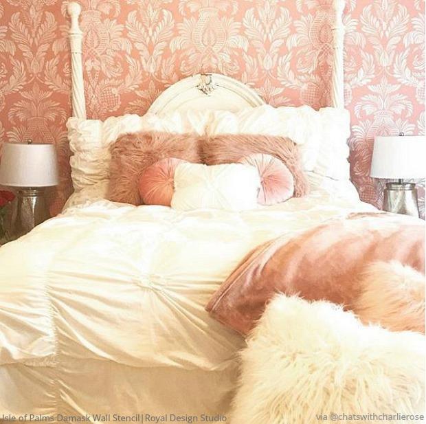Our elegant Isle of Palms Damask Wall Stencil is large pattern that can be repeated on an accent wall or entire room to create a Victorian wallpaper look. With stencils, it is so easy to create different and unique looks. You can use dramatic contrasting paint colors or tone on tone finishes similar to what we did in the project photos below.