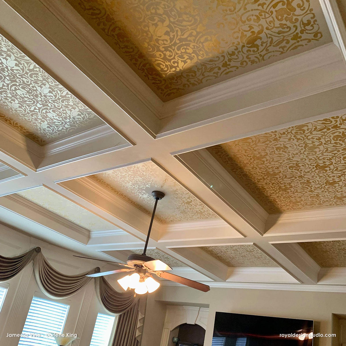Our Jameela Vine Moroccan Wall Stencil features delicate vine and leaf patterns that gives walls a feminine and exotic feel, making it the perfect addition to our popular Moroccan Stencil Collection. On the accent wall shown above, we kept it mysterious and exotic with darker tones, but you can also interpret it in bright contrasting colors as well. That's why wall stencils are so great - you can create any look you want just by changing up the color paint you use!