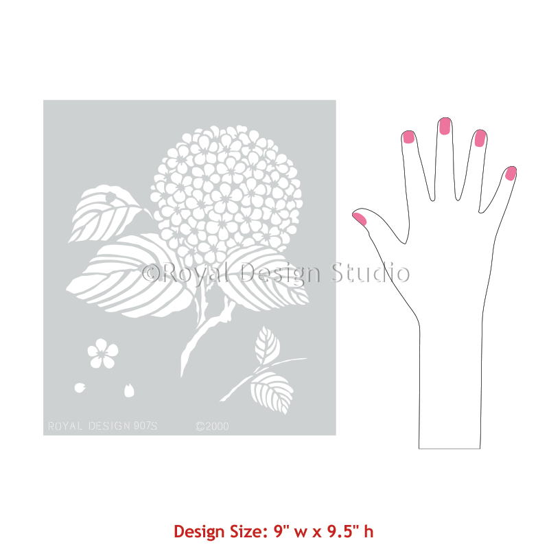 This flower stencil and wall art design has a lot of possibilities. Our Japanese Hydrangea Floral Stencil can be used for stencil gilding, scattered randomly over a wall, or stenciled on fabric. The smaller leaf grouping (included) can be scattered amongst the larger floral motif for more interest. The large size flower stencil design makes it easy to create an original, random pattern across you wall, simply by rotating and flipping the main stencil pattern, and then filling in with the smaller leaves and adorable floating flower petals.