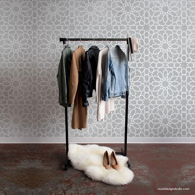 The Kasbah Tile Stencil is a Moroccan tile lover's dream come true! You can paint a floor with these bohemian stencils to mimic the look of real Moroccan zelij tiles. Likewise, you can also paint walls with this modern stencil design for a geometric mural look.