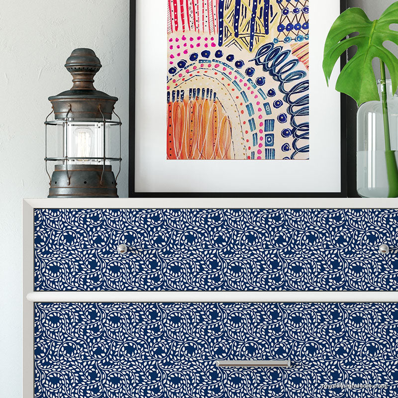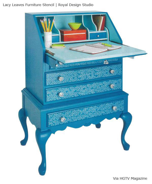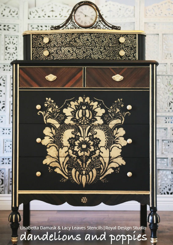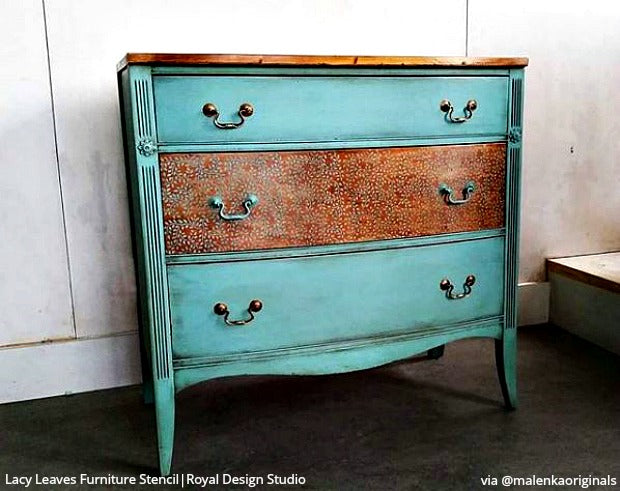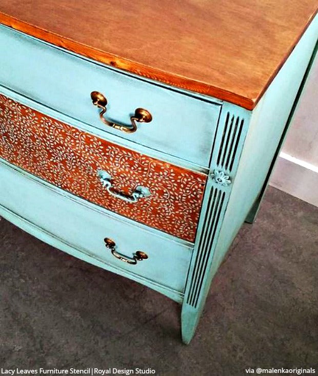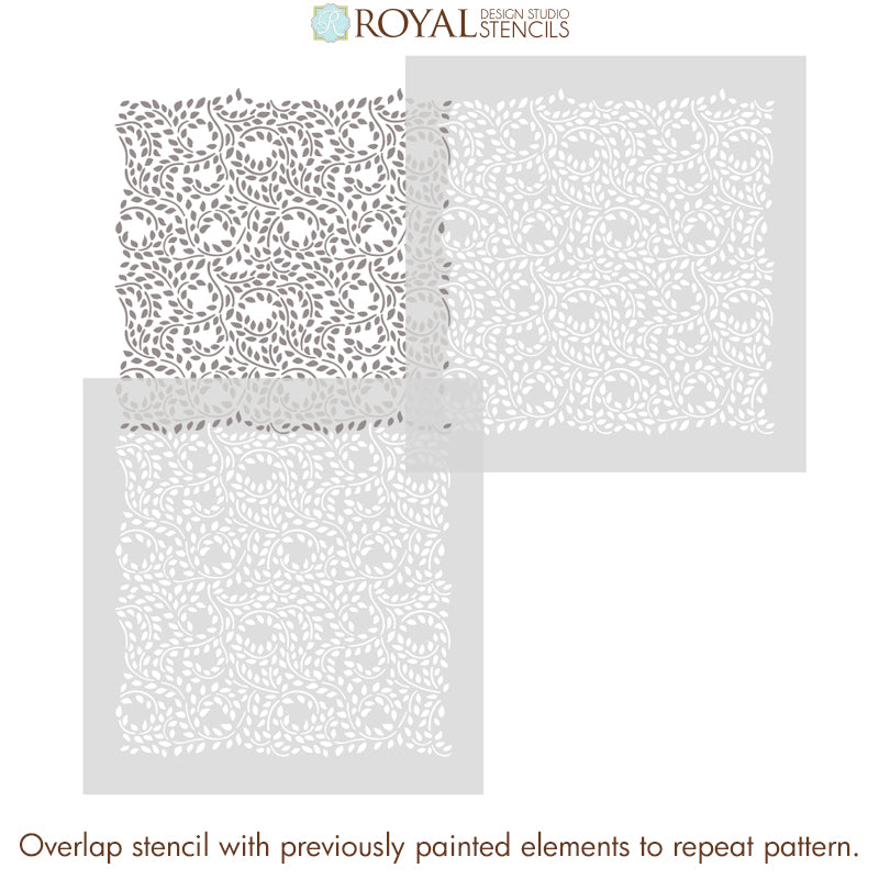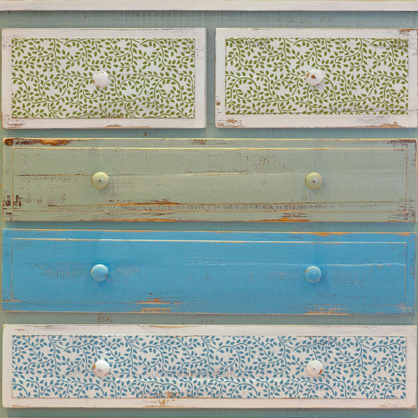 You will love our little Lacy Leaves Furniture Stencil for furniture and craft stencil projects! The delicate leaf and vine pattern works great on painted dresser drawers, tabletops, and painted fabric! Use the Lacy Leaves Wall Stencil for a large scale floor design or feature wall.