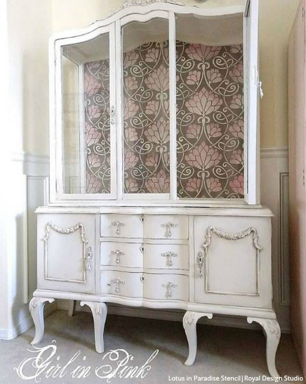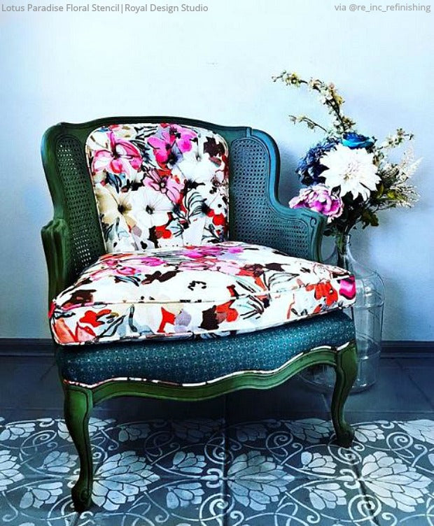 Our Lotus Paradise Floral Wall Stencil is an allover flower stencil that's perfect for spring time projects! This new floral stencil design brings the Art Nouveau look to your home with a flowing flower and vine motif. For the stenciled wall shown, we used our Royal Stencil Cremes to highlight this retro-inspired design with shimmering metallic color.