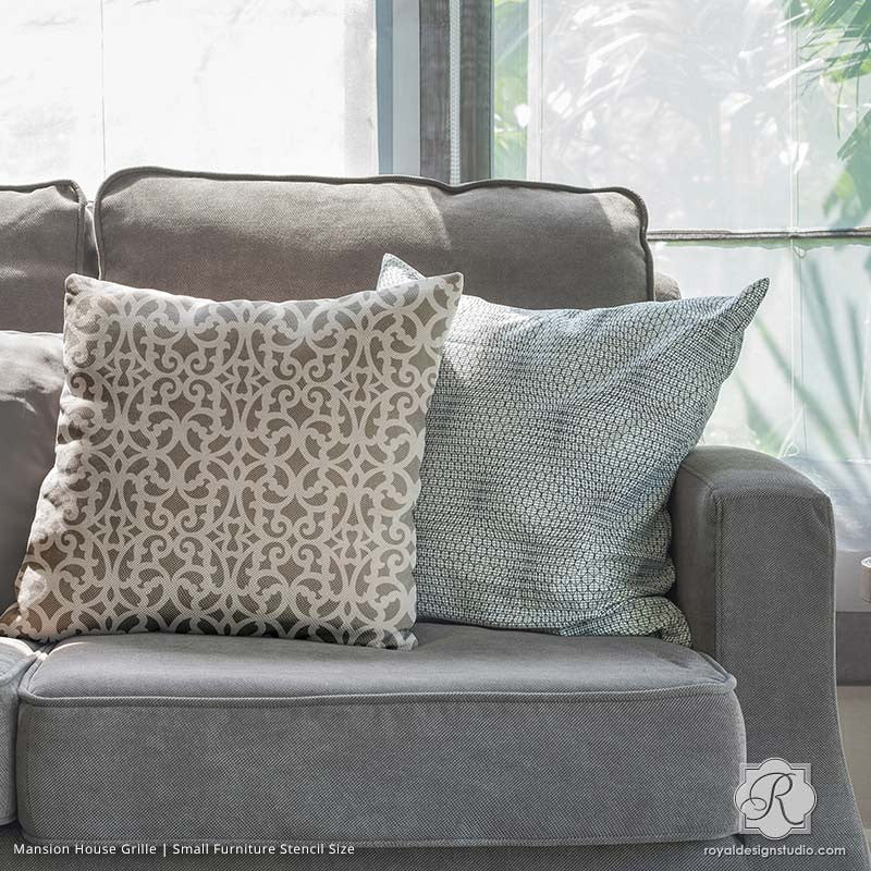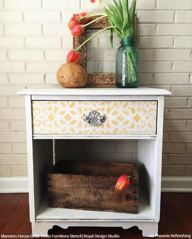 The exotic and geometric design of the Mansion House Grille Trellis Furniture Stencil is super easy to stencil and extremely versatile for many decorating styles. Stencil a your bookcase, dresser, or dining table - the possibilities are endless! For larger DIY projects such as an accent wall, use our Mansion House Grille Trellis Wall Stencil.