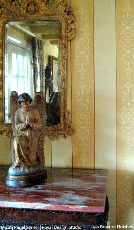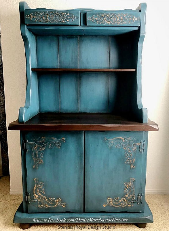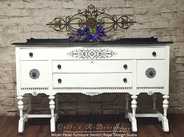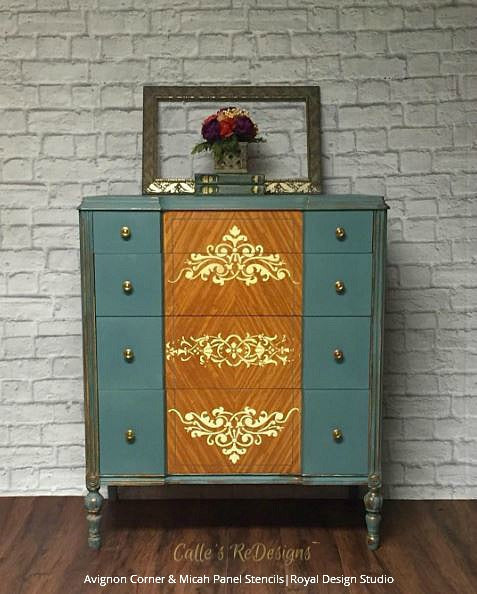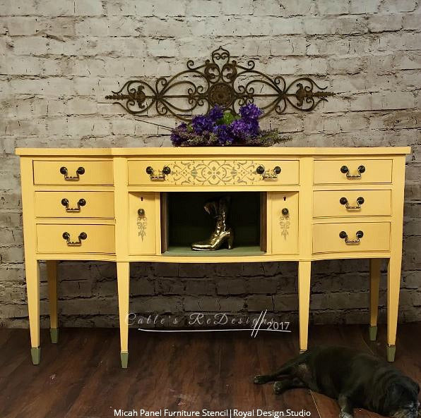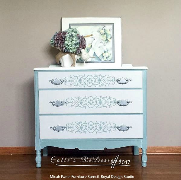 Our Micah Classic Panel & Furniture Stencil is a classic panel stencil design that is offered in two sizes. The furniture stencil size is featured here in the cabinet photos. Use the larger size repeated around a ceiling line for a beautiful stenciled frieze. This design is also available as a two layer stencil to achieve a more hand painted look: Micah Theorem Classic Panel Stencil.