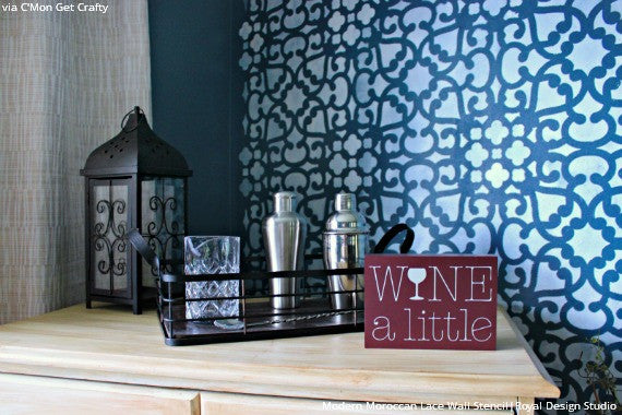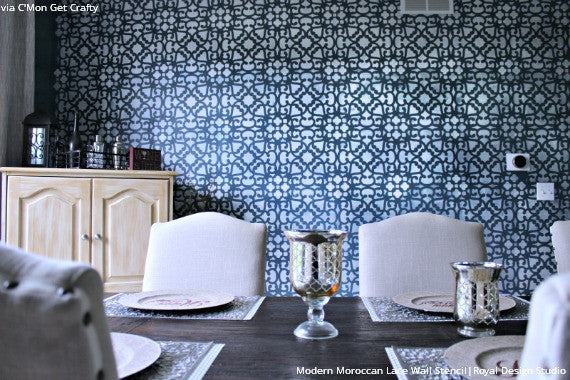 Our Modern Moroccan Lace Wall Stencils with easy-to-use registration marks allow you to easily repeat across your wall perfectly every time. Create a bold and exotic stenciled wallpaper effect in your bathroom or bedroom, or simply stencil an eye catching accent wall.This intricate lace stencil includes a FREE ceiling filler stencil element to finish the pattern easily at your ceiling line. For smaller DIY projects such as painted furniture or cabinets, use our Modern Moroccan Lace Furniture Stencil.
