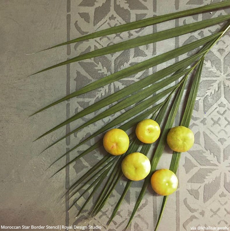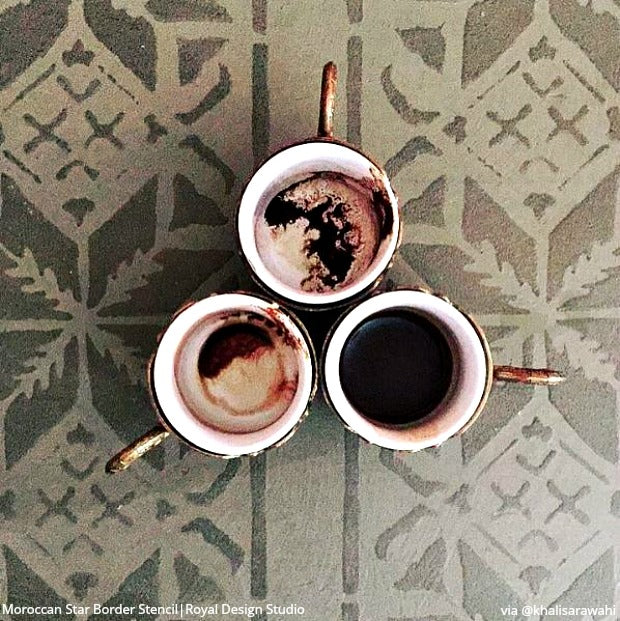 Use this large-scale, Moroccan Star Border Stencil border alone on painted furniture or feature walls. Mix and match with our other Moroccan border stencils for stenciled stairs and floors: Fez Block Border, Moroccan Lace, or Fez Floral Border.