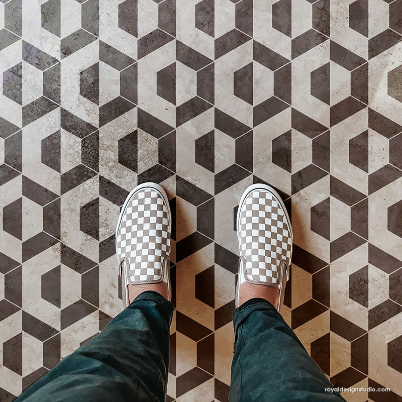 Our Nexus Modern Allover Wall Stencil features a subtle optical illusion in a modern, graphic mosaic tile design. Great for stenciling walls or floors, you can add an additional stencil color to the center design area for even more pop!