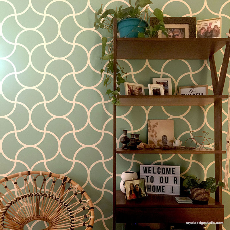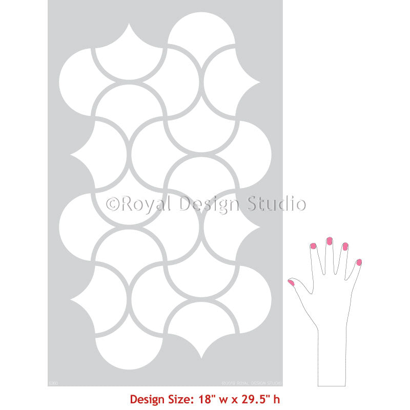 The Osaka Scallops Allover Wall Stencil is sized perfectly for painting a large feature wall or flooring with the modern tiles or Art Deco tile look. This large stencil includes multiple tile repeats making it fast and easy to complete a wall or floor. Use the smaller Osaka Scallops Tile Stencil to paint your individual bathroom floor tiles.