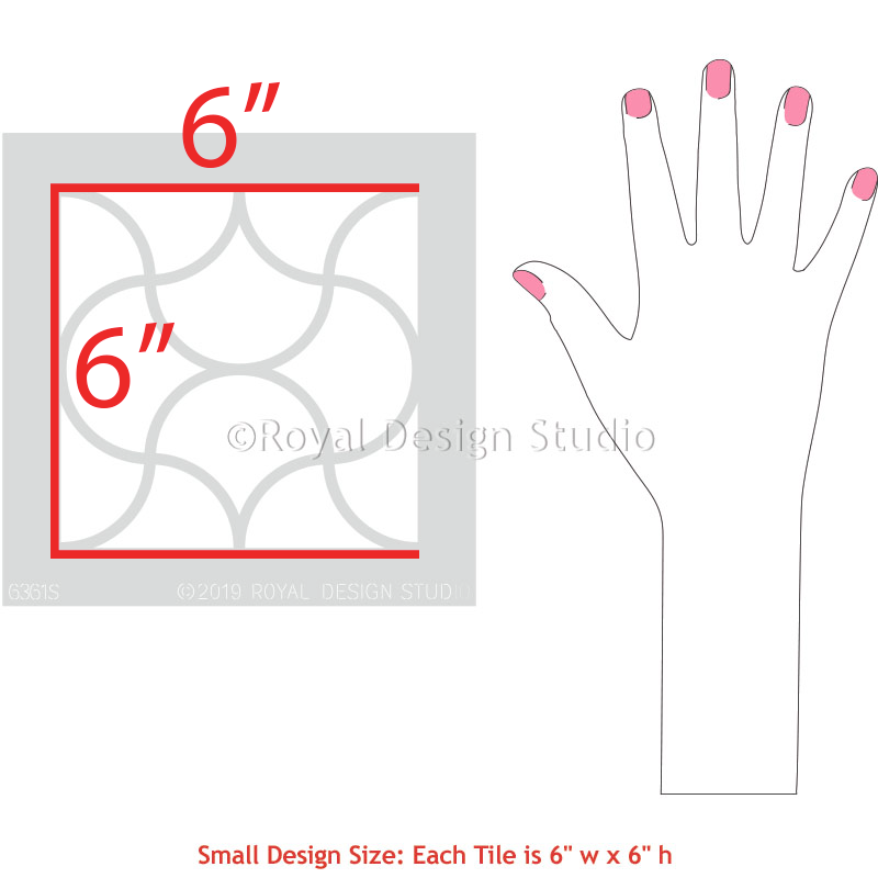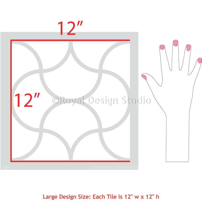 A modern design that can go just about anywhere! The Osaka Scallops Tile Stencil is a geometric tile pattern for painting floors and modern kitchen backsplashs. The curved scallop lines make this tile painting stencil a great addition to Art Deco or Asian style interiors. To stencil a wall or floor super fast, use the Osaka Scallops Allover Stencil, which features multiple repeats of this tile design.
