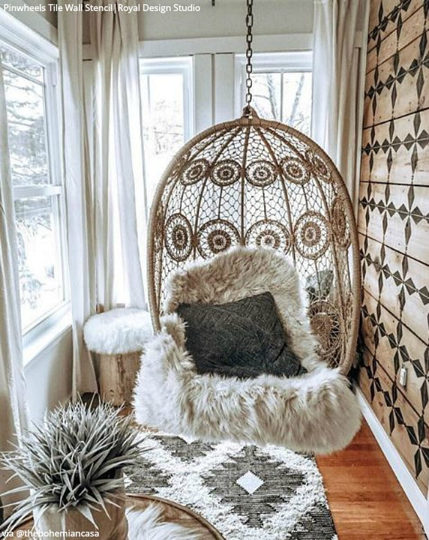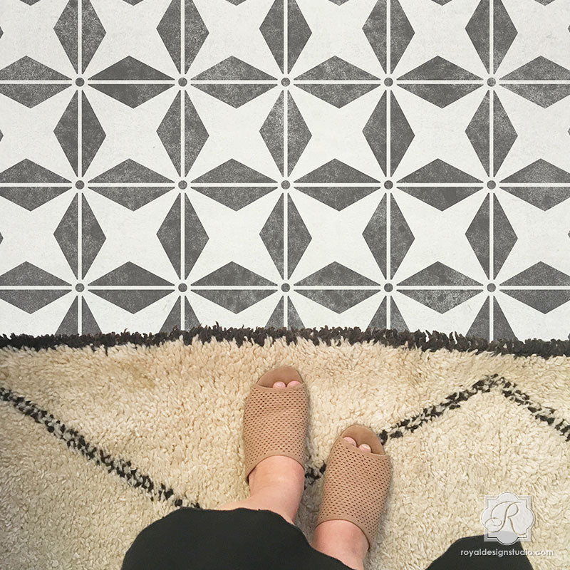 Painting directly on your tiled floors has never been easier! Here is a fast and easy DIY hack: Use the Pinwheels Tile Stencil to create a geometric design for your Moroccan, bohemian, or modern style home.