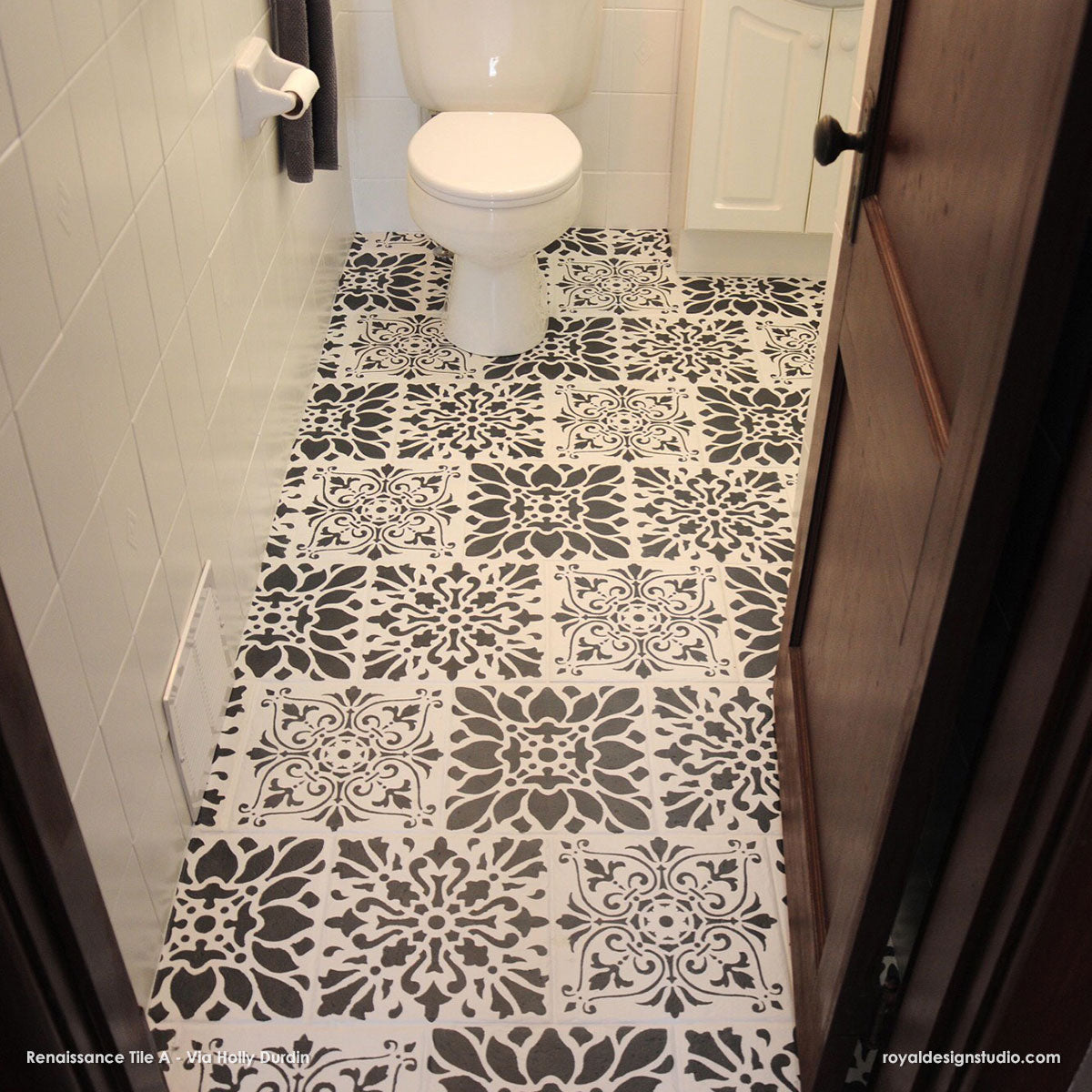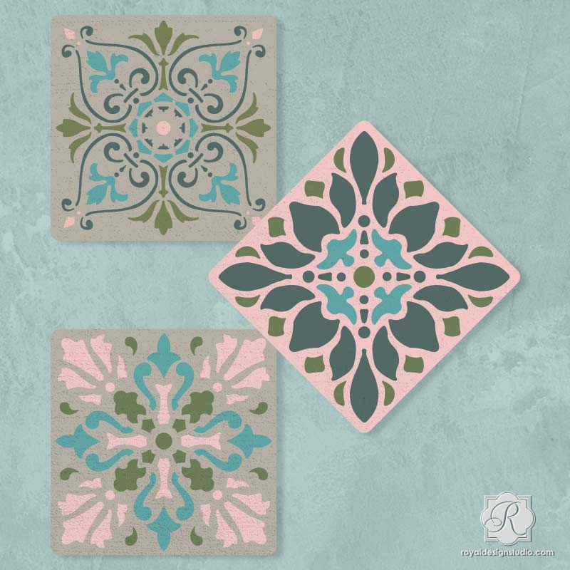 Decorate and paint a faux tile design or random wall art motifs with our Renaissance Tile Stencils Set A. These traditional European tile patterns coordinate with our Renaissance Tile Stencils Stencils Set B. Complete the classic tiled look on your floors or kitchen backsplash with these tile stencils and our Ceramic Tiles Trompe L'oeil Stencil.