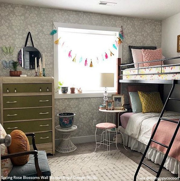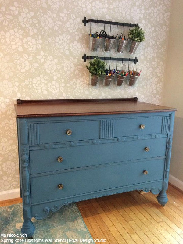 Paint beautiful flowers and leaves on an accent wall in your bedroom or outside on decorative concrete. Our Spring Rose Blossoms Wall Stencil can be painted in one color or painted with contrasting leaf and petal colors! For smaller DIY projects such as painting a dresser or table top, use the small Spring Rose Blossoms Furniture Stencil.