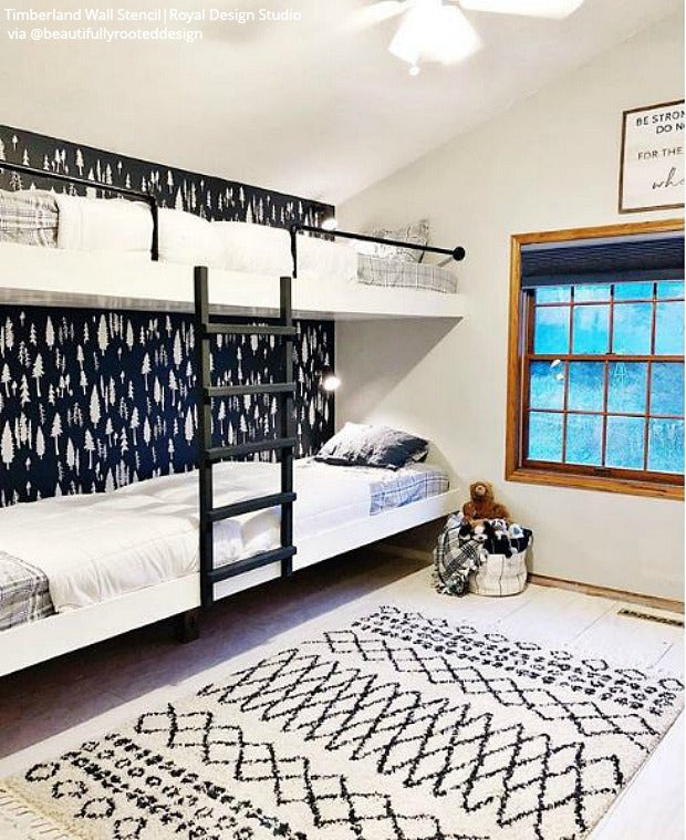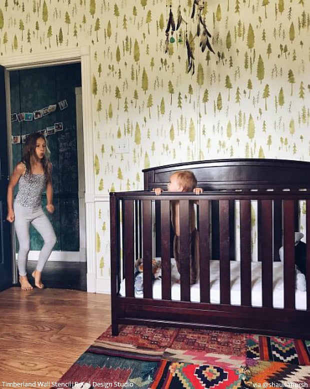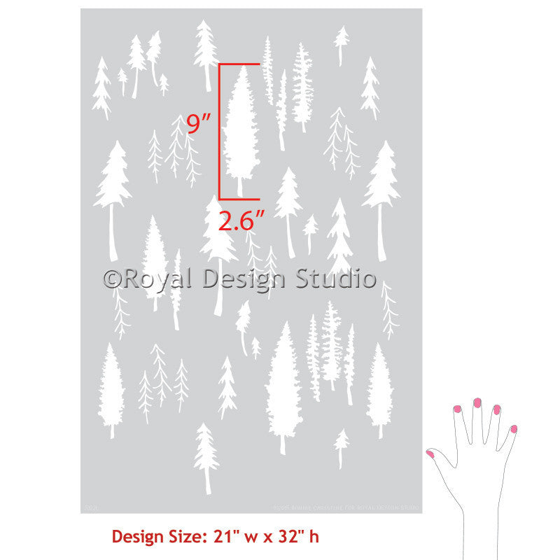 Wander through the forest and walk into an outdoors adventure with our Timberland Bonnie Christine Wall Stencil. Decorating your bedroom walls with a modern and rustic look of trees has never been easier with designer wall stencils. Use this large size stencil pattern for wall and floor stencil projects. Pattern available in a smaller scale: Timberland Bonnie Christine Furniture Stencil