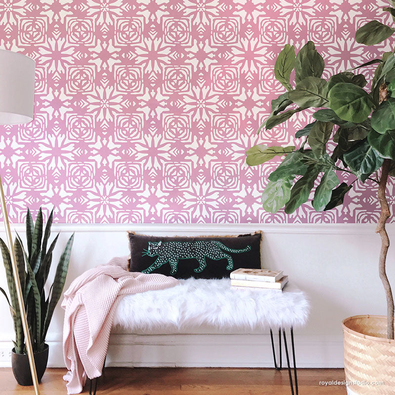 Tribal decor is so dreamy that we've been seeing it everywhere! Paint the Tribaliste Wall Stencil on a feature wall for a tile wall design that has an African style geometric pattern. Wall paint and stencils like this one make it so easy to create a custom wallpaper look.
