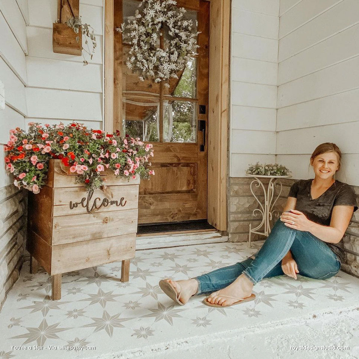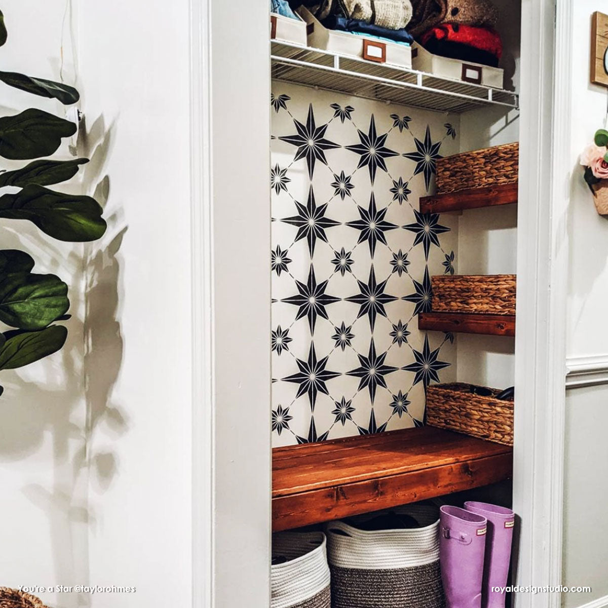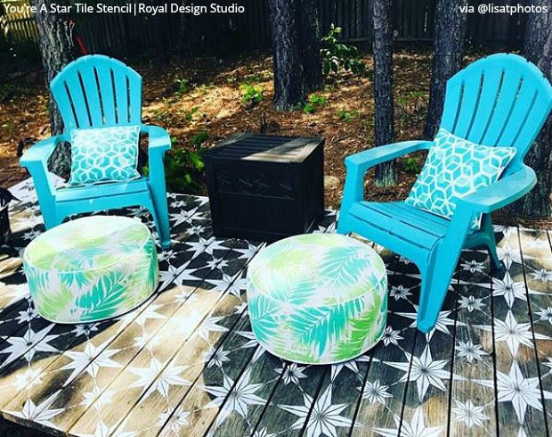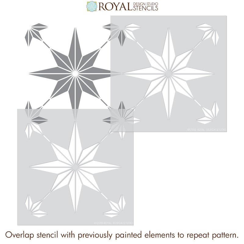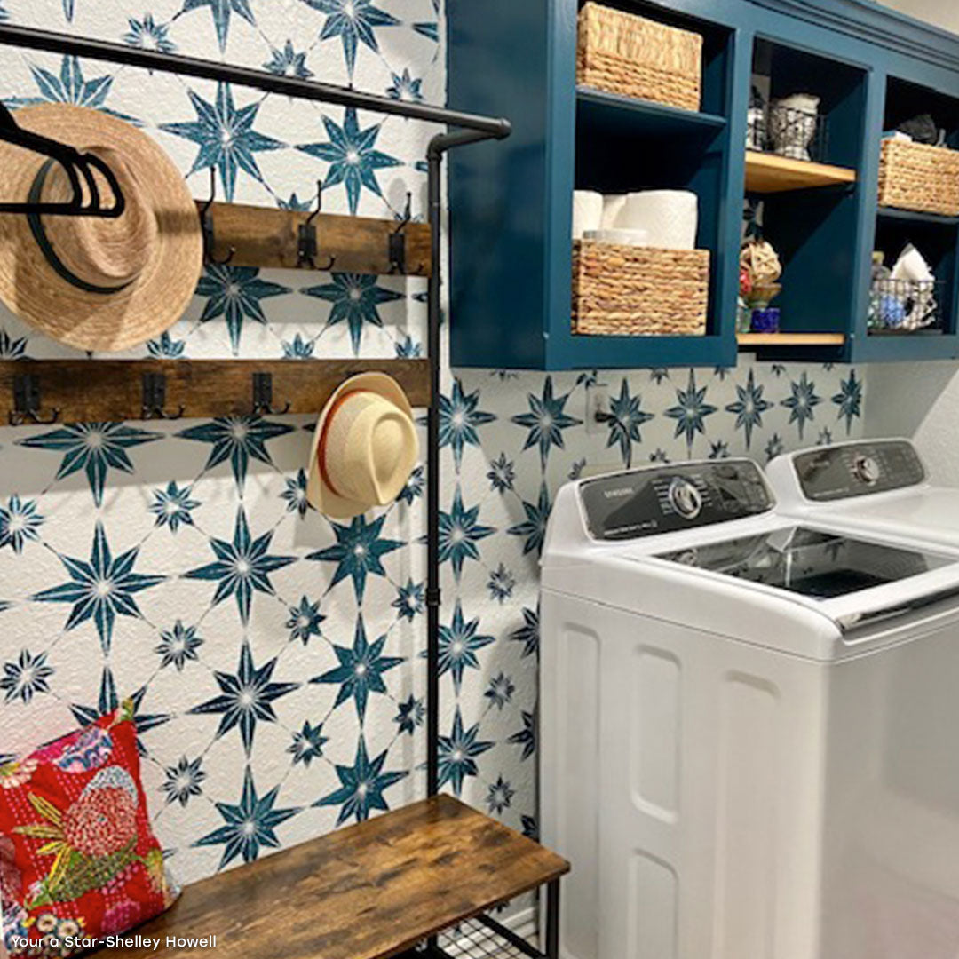Paint your floor with the You're a Star Tile Stencil... Your decor project will look like real floor tiles, but will be affordable and easy to do it yourself (DIY). This geometric tile stencil also looks great as a modern kitchen backsplash too! To stencil a wall or floor super fast, use the You're A Star Tile Allover Stencil, which features multiple repeats of this tile design.